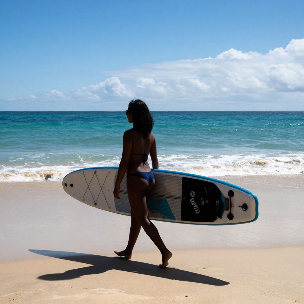 Woman walking along the sandy beach carrying a sleek stand-up paddleboard, her silhouette framed against the vibrant turquoise ocean and scattered clouds under a clear sky.