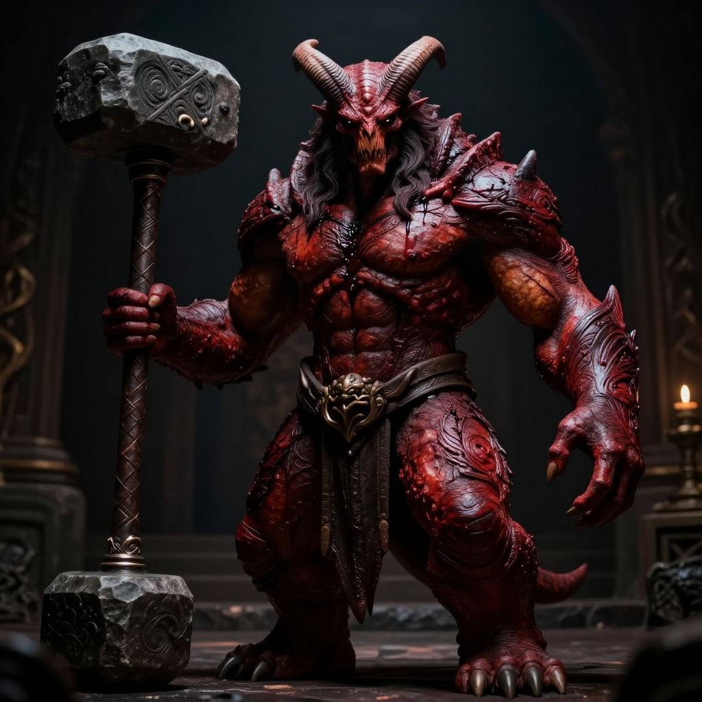((cinemtic shoot)) ((fantasy)), ((rpg)), ((focus on character)), full body shoot, photo of Kok'Thal - A towering, muscular figure covered in thick, burnished red scales. Ritual scars crisscross his body in intricate patterns, some oozing blackened blood. Curved horns sweep back from his elongated skull as beady black eyes glare from beneath a heavy brow ridge. Massive arms wield an immense stone maul adorned with fanged carvings., envy, intricated skin, realistic, ((photorealistic)) rim lights, dark shadows, cinematic scene, movie shoot, dark, extremely detailed, hard light hard shadows, shallow depth of field, vignette, highly detailed, high budget Hollywood film, cinemascope, moody, epic, gorgeous, detailed background, ((darkfull )), detailed, SK_ANALOGFILM