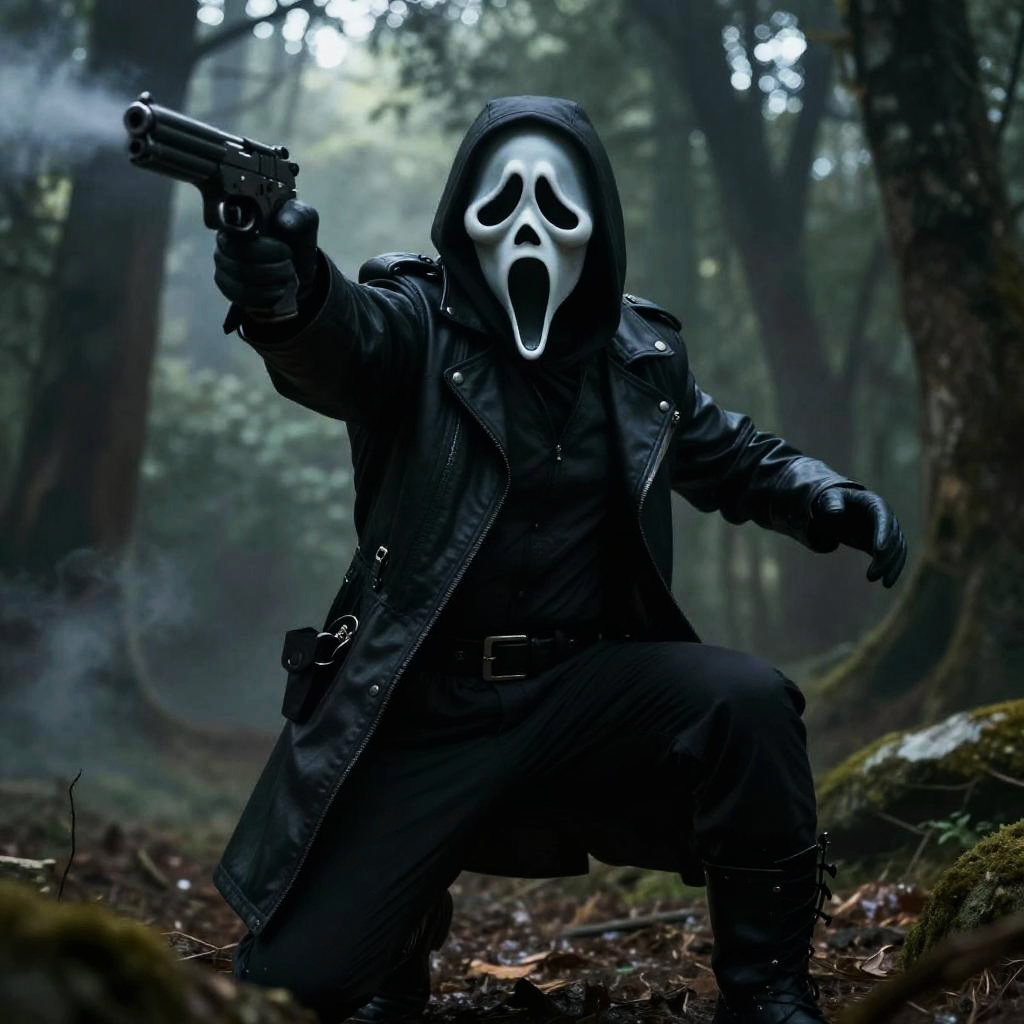 Ghostface with gun, cinematic action shot, dynamic pose in dimly lit forest, mist rising, ominous atmosphere, sharp focus on mask and weapon, dark horror art style