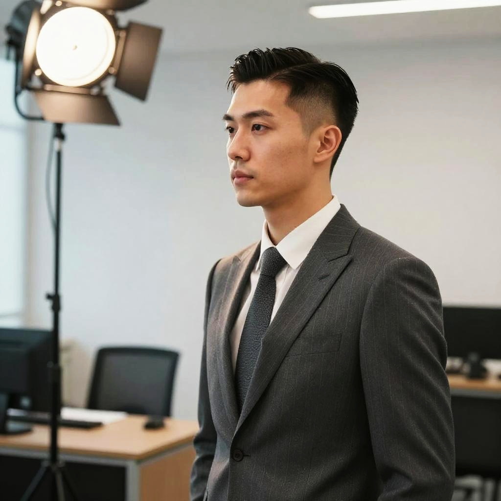 Slick Back Undercut hairstyle on businessman, wearing pinstripe suit, in corporate office, captured in fashion editorial style with bright overhead spotlight.
