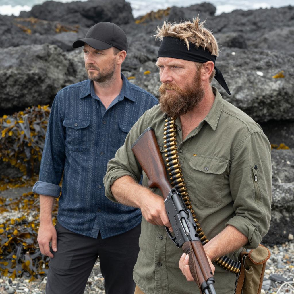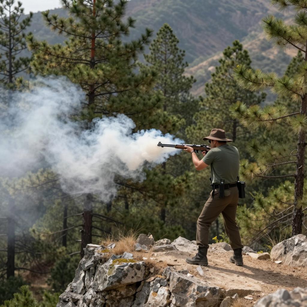 Bearded man with receding hairline, wearing plaid shirt and brown vest, holding rifle, smiling. Background: white pickup truck, dry shrubs. Daylight. Man in front of truck, right side. Casual outdoor setting.