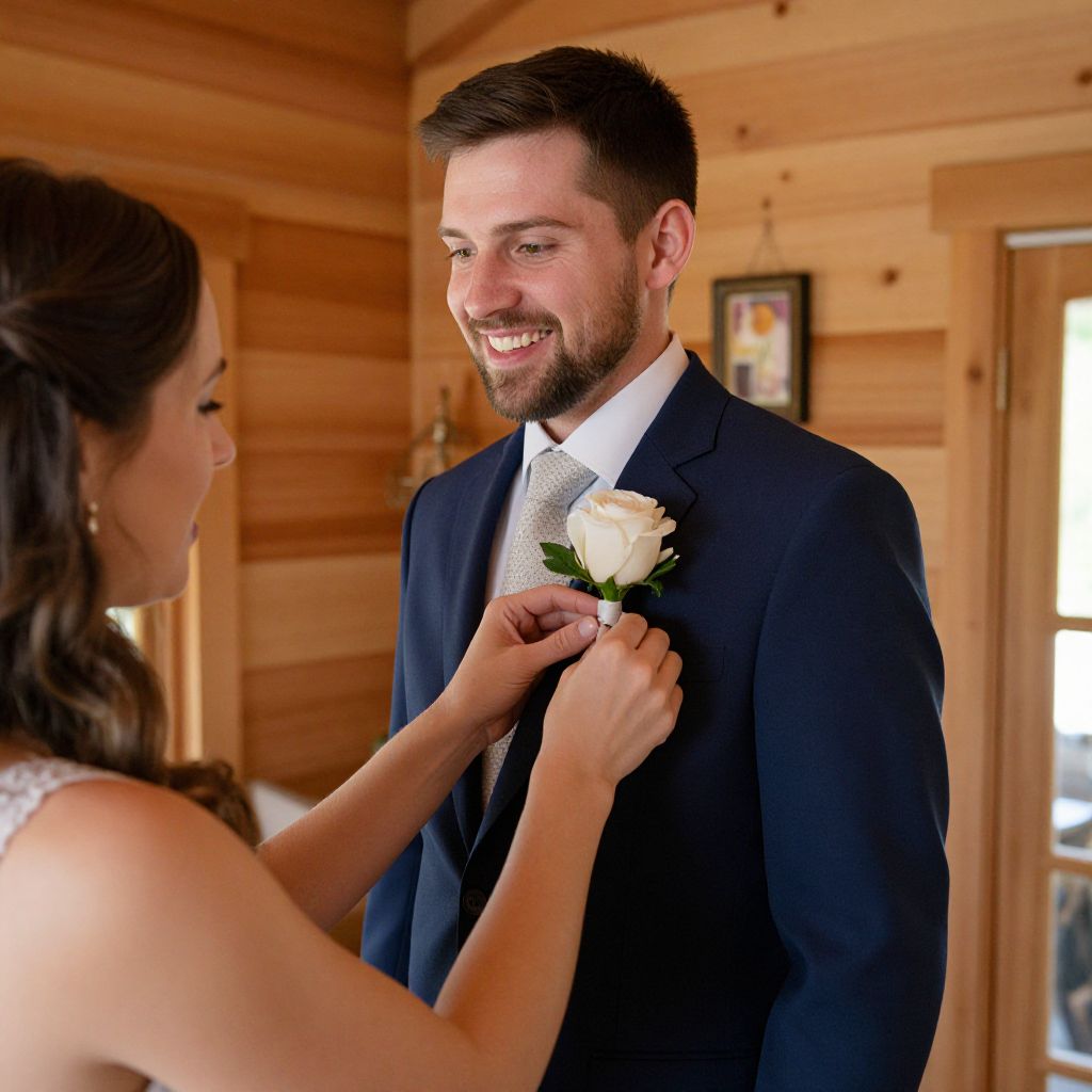 Groom smiling warmly as a woman carefully pins a white rose boutonnière onto his navy suit jacket in a cozy wooden cabin setting.