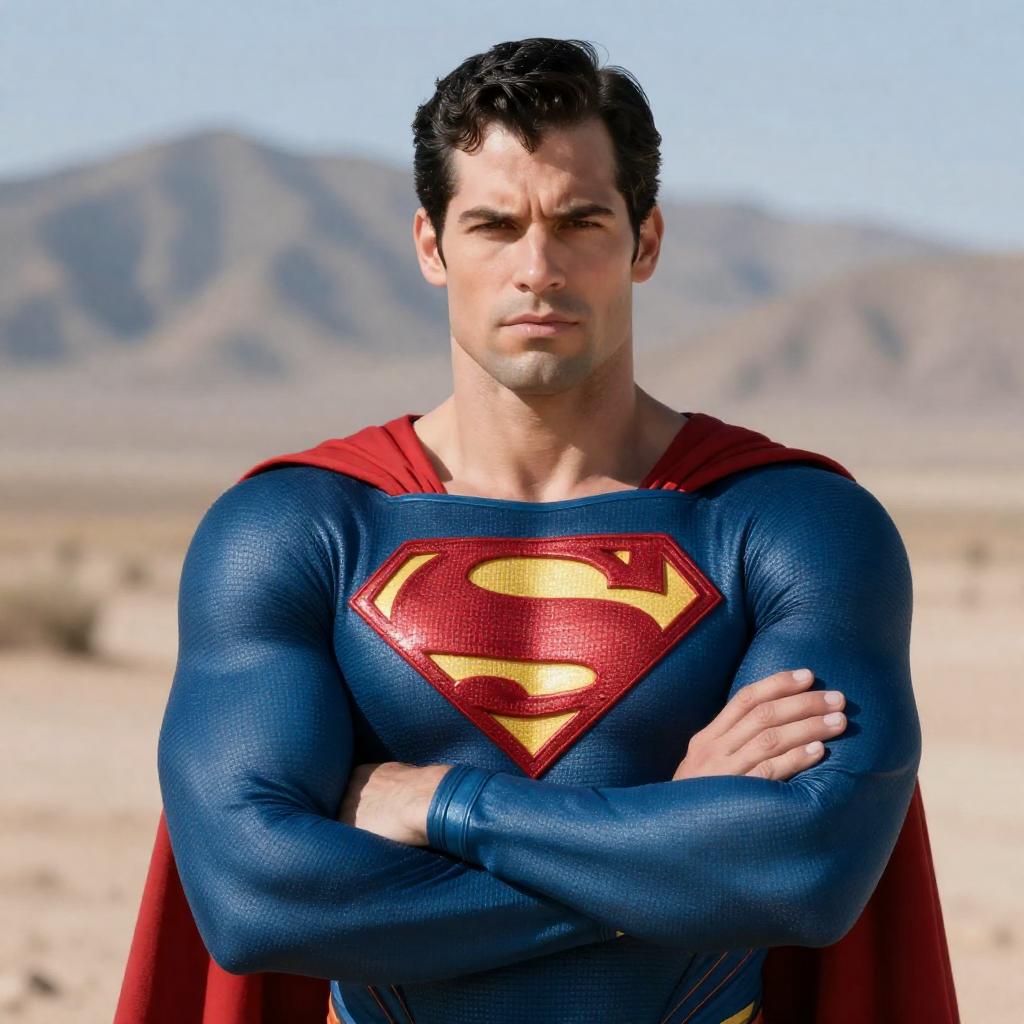Photograph of a muscular man with short, dark hair in a Superman costume with a red and blue suit, and a shiny, ured chest emblem. He stands in a blurred desert landscape with mountains in the background. His arms are crossed, and he has a serious expression.