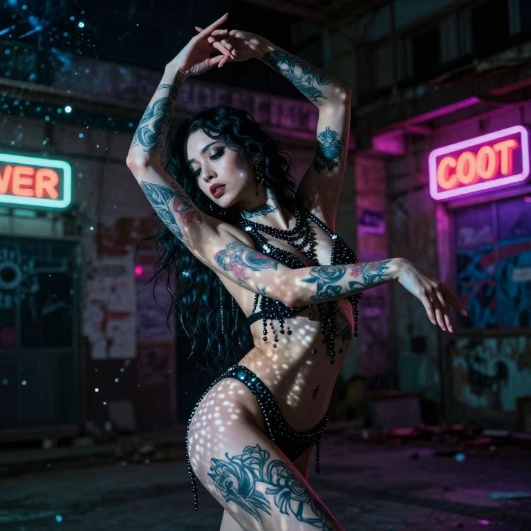 Craft a photorealistic portrait of a mystical dancer in motion, captured from an unconventional viewpoint as if through a shimmering water surface. Blend gothic and modern aesthetics with intricate tattoos adorning her arms and legs. Highlight the interplay of light and shadow, featuring glistening beads on her body that cast ethereal reflections across her skin. Set against a backdrop of urban decay juxtaposed with vibrant neon-lit signs, this scene reflects both the dancer's inner strength and vulnerability.