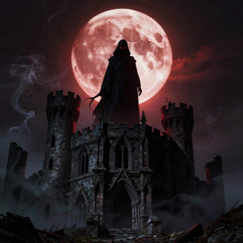 Silhouetted hooded figure stands on ruined castle against bright red full moon, surrounded by dark clouds and smoke. Gothic horror digital art.