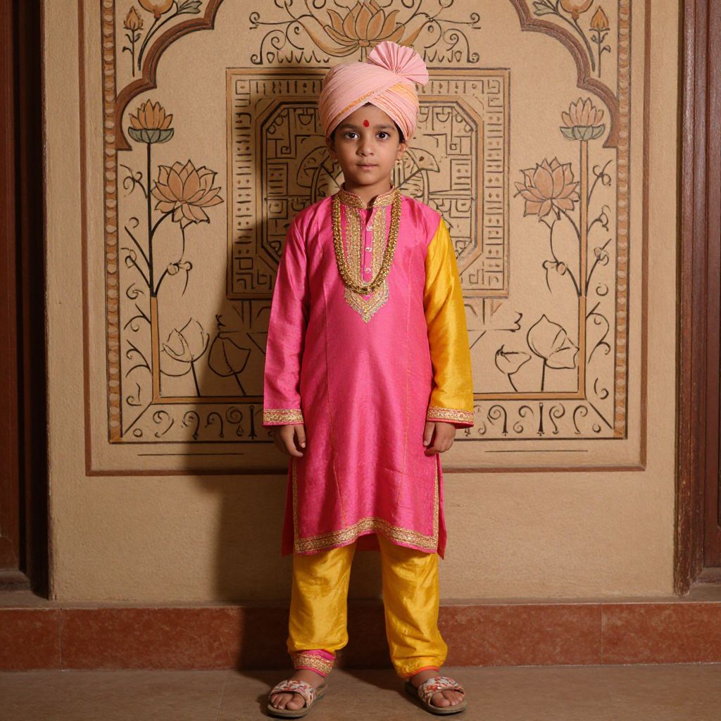 A young boy, around 8 years old, stands confidently in front of a wall adorned with an intricate, hand-painted design featuring traditional Indian motifs like lotus flowers, geometric patterns, and scrollwork. He is dressed in a vibrant traditional Indian outfit: a bright pink and yellow cotton kurta with detailed gold embroidery along the sleeves and hem, paired with a golden necklace that glimmers in the light. He wears a delicate pink turban wrapped neatly on his head, adding a touch of elegance and cultural pride. His feet are covered with soft, patterned sandals that match the overall color scheme. The setting is warm and inviting, with soft natural lighting casting gentle shadows, emphasizing the richness of the textiles and the cultural details of the scene.