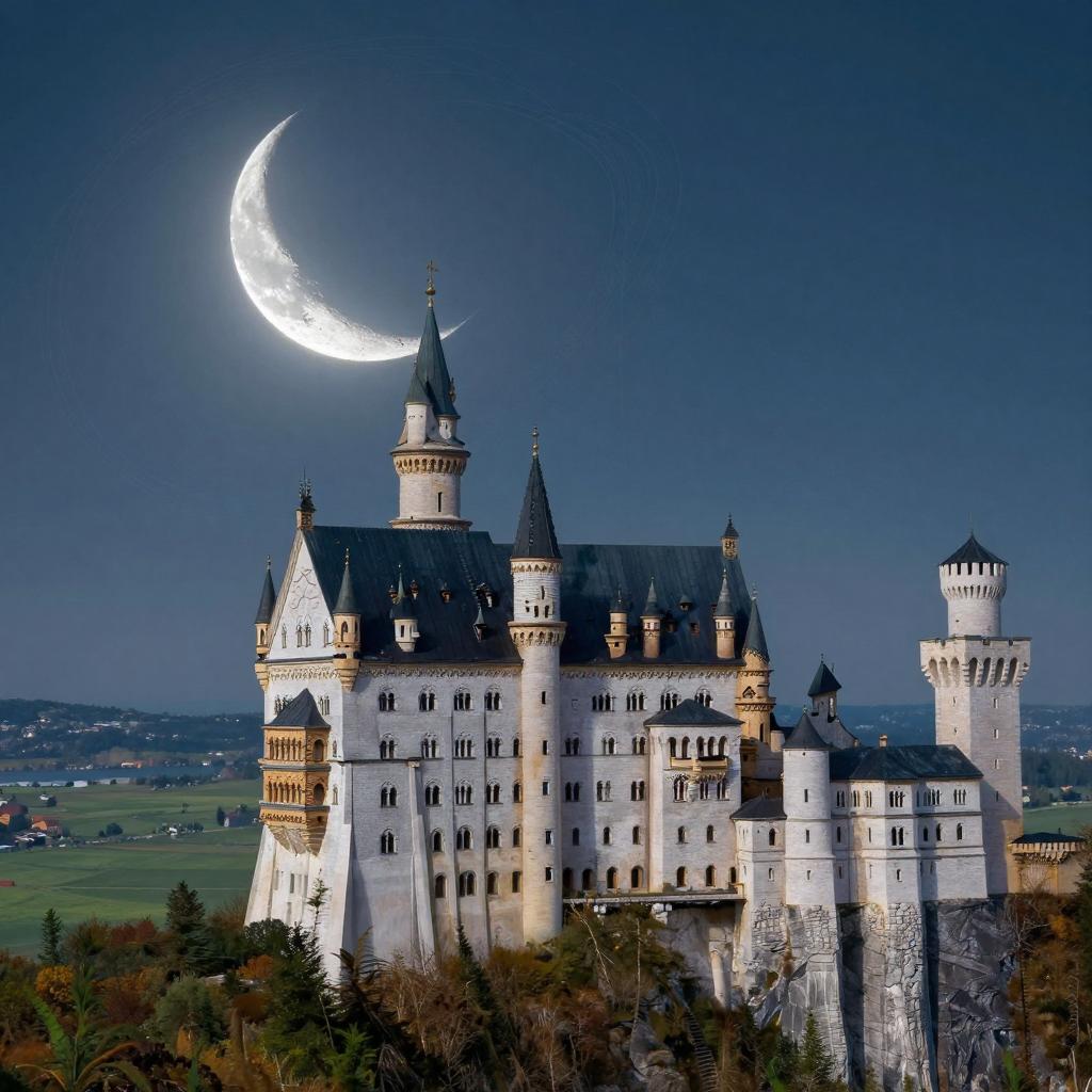 A detailed fantasy castle perched on a rocky hilltop with multiple spires and turrets. The scene showcases a dramatic crescent moon surrounded by swirling celestial patterns in the night sky. The castle is illuminated by soft natural light, with a mountainous landscape extending into the horizon.