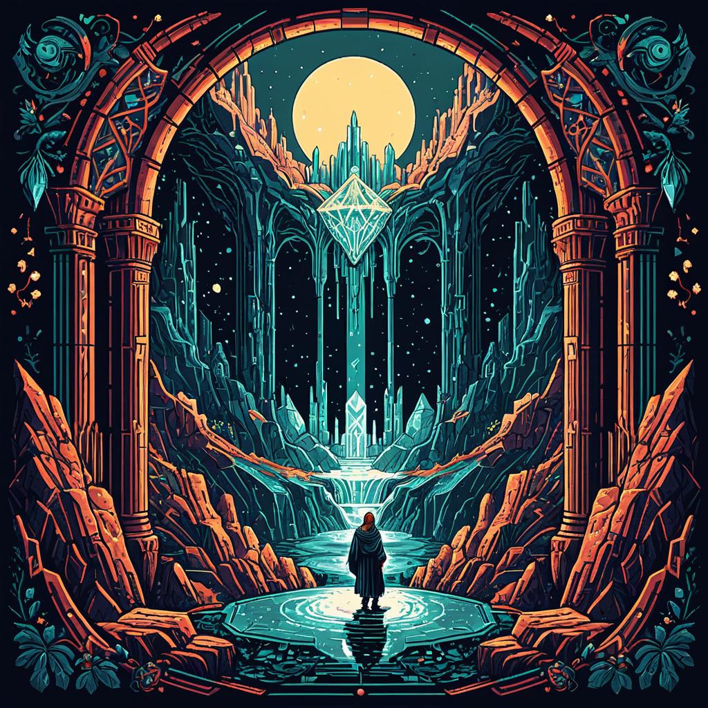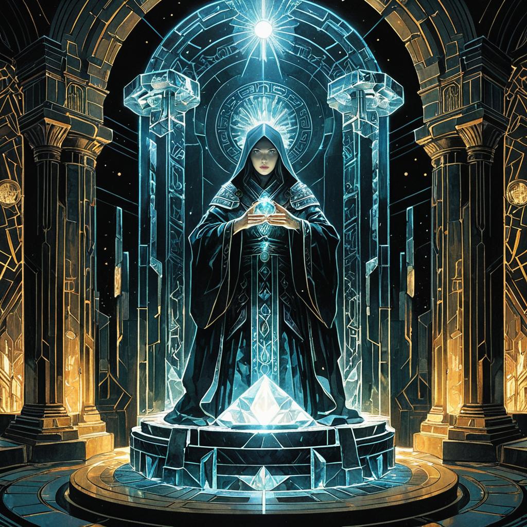 A young seeress stands at the glowing entrance of ancient ruins surrounded by towering stone pillars adorned with runic markings. Above, a luminous astral symbol hovers amid a cosmic, star-filled haze, creating a mystical and calm atmosphere. The scene is rendered in a style reminiscent of Studio Ghibli, emphasizing magical and enchanted elements with soft lighting and vibrant colors.