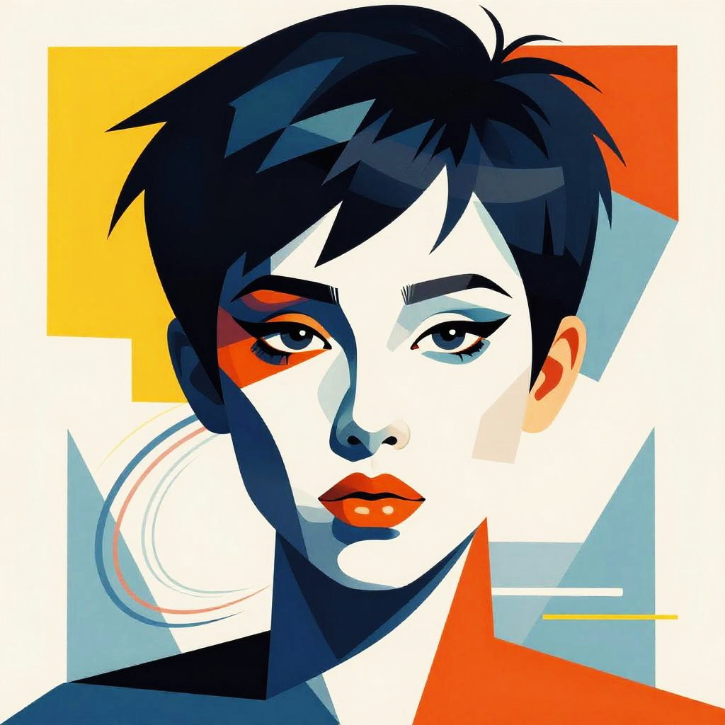Abstract digital art featuring pixie cut filter on a stylized face, bold geometric shapes with sharp edges mimicking short hair, contrasting vibrant colors, dynamic composition with swirling patterns and light effects, modern graphic design inspired by cubism and pop art.