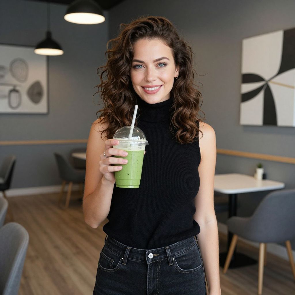 Photograph of a smiling woman with wavy dark brown hair, wearing a sleeveless black ribbed turtleneck and high-waisted black jeans. She holds a green smoothie with a white straw in her right hand. The background features a modern, gray-walled cafe with black chairs, wooden floors, and abstract black-and-white wall art. Two pendant lights hang from the ceiling. The woman's light skin and bright smile contrast with her dark top and jeans. The cafe setting is well-lit, creating a bright, inviting atmosphere.