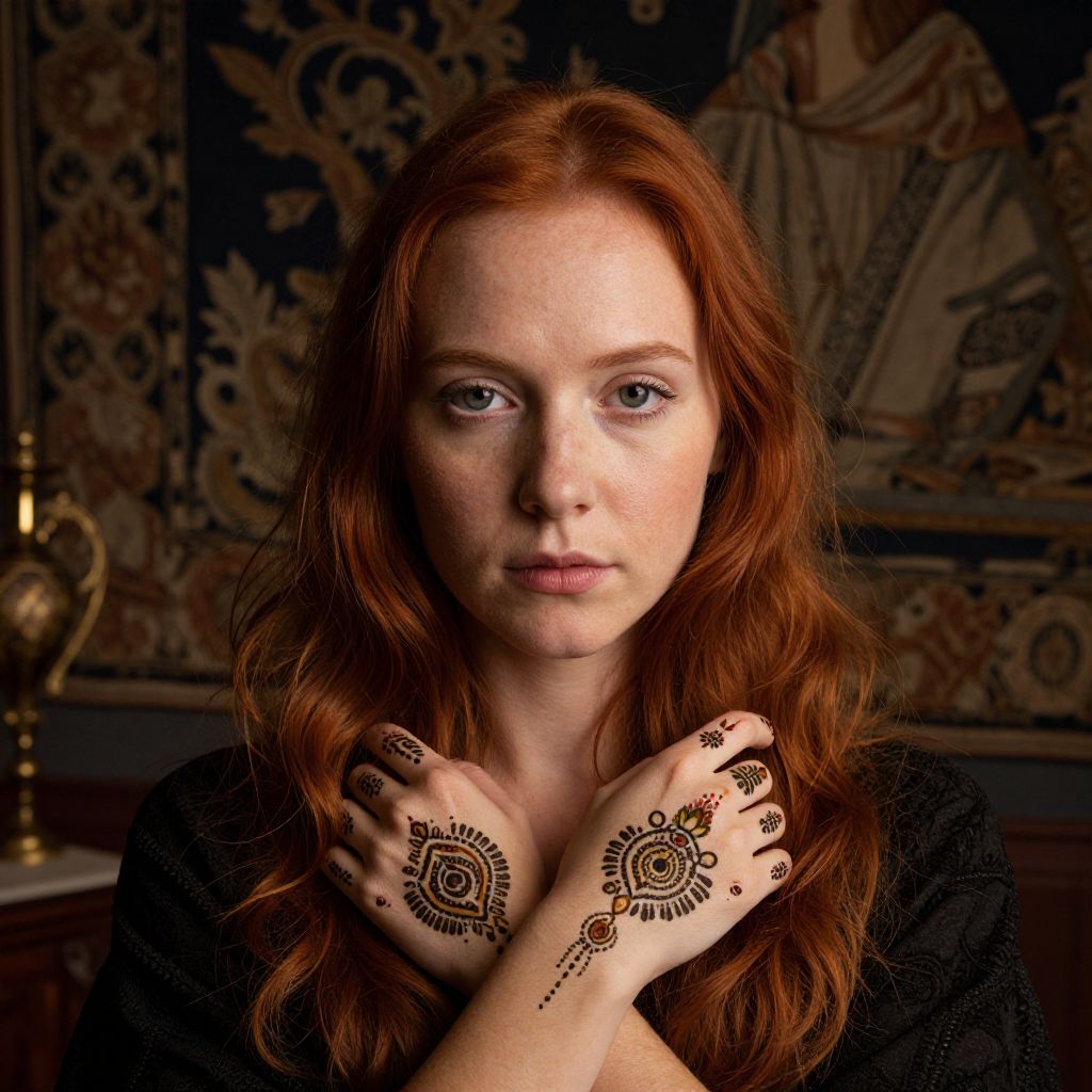Create a photorealistic portrait of a young Nordic woman with vibrant red hair and serene green eyes, capturing the essence of Renaissance art yet infused with contemporary fashion sensibilities. The close-up shot highlights her face, bathed in warm golden light that casts subtle shadows across her features. Her hands are adorned with intricate henna tattoos, symbolizing cultural heritage blended with modern aesthetics. Her expression conveys a unique blend of vulnerability and strength as she maintains an introspective pose amidst an enigmatic studio setting where ornate tapestries and antique furnishings subtly merge into the background, creating a captivating fusion of historical elegance and urban sophistication.