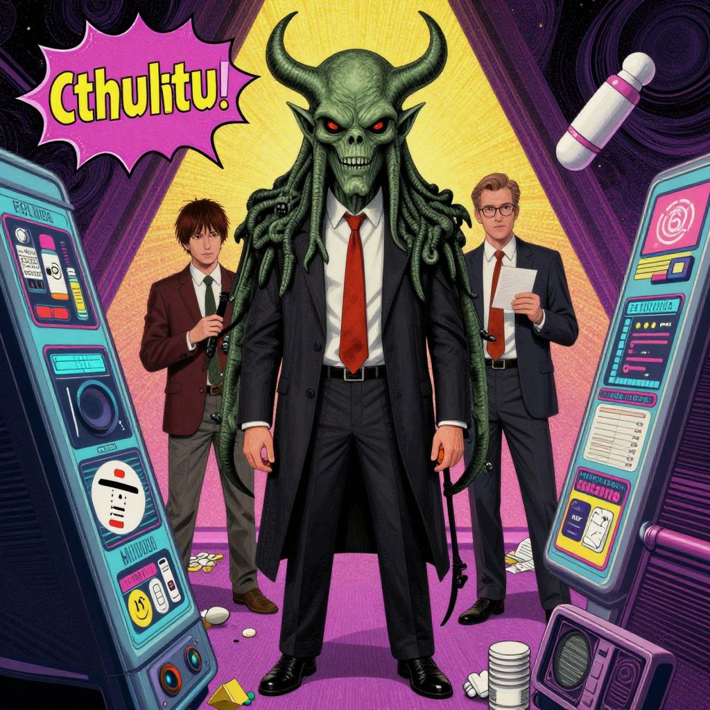Cthulhu as a modern day business man with a family and a drug and gambling addiction, junji ito and greg rutkowski, psychedelic , 50s style infomercial , award winning , retro futuristic
