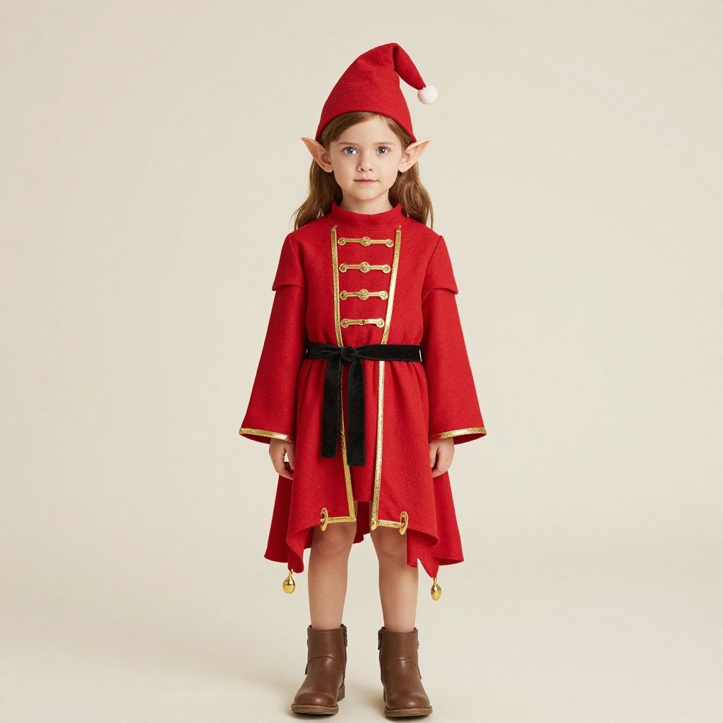 Photograph of a young girl with light skin and long brown hair, standing against a plain white background. She wears a red elf costume with pointed ears, a red hat with a single point, long-sleeved dress with gold trim and black buttons, and a black belt. The dress has a slightly asymmetrical hem. She also wears brown ankle boots with buckles. Her expression is neutral, and she stands facing the camera with her arms relaxed by her sides. The costume is detailed and vibrant, contrasting with the simple background.