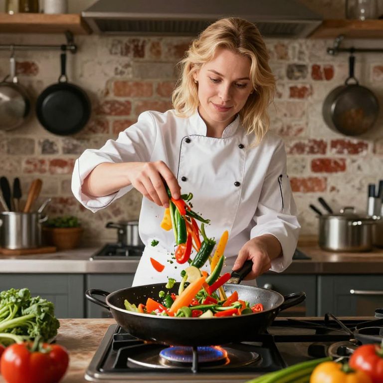 Photograph of a blonde Caucasian woman with wavy hair, wearing a white double-breasted chef's jacket, cooking in a rustic kitchen. She is chopping colorful bell peppers, carrots, and green beans over a black frying pan on a gas stove. The background features a brick wall, hanging pots, and metal utensils. The foreground includes fresh vegetables like broccoli, tomatoes, and green beans. The lighting is bright, highlighting the vibrant colors of the vegetables and the chef's focused expression. The kitchen has a cozy, homey feel with a mix of modern and rustic elements.
