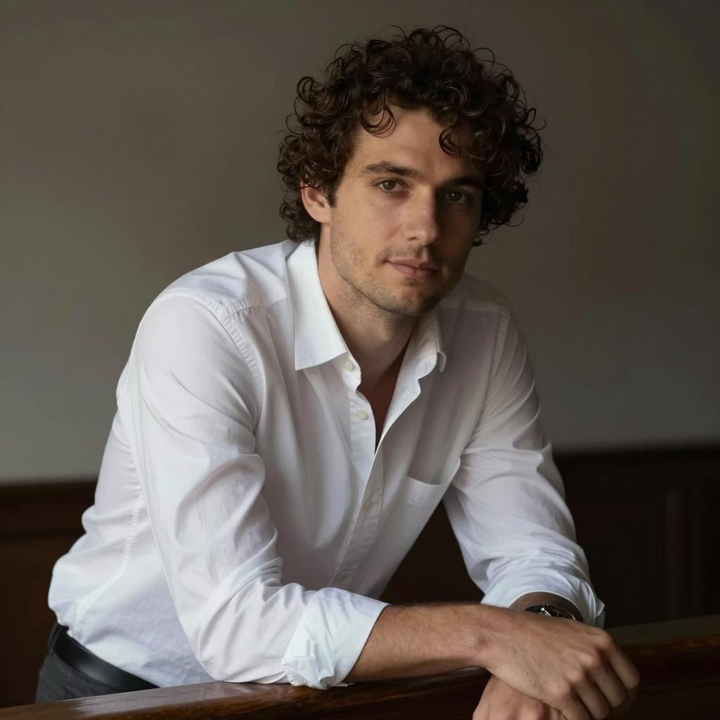A young man with curly brown hair, light brown beard, and blue eyes. He wears a light blue, patterned shirt with a green and yellow necklace. Two partially visible people on the sides, one in white, one in dark maroon. Dark, blurred background. The man's expression is neutral.