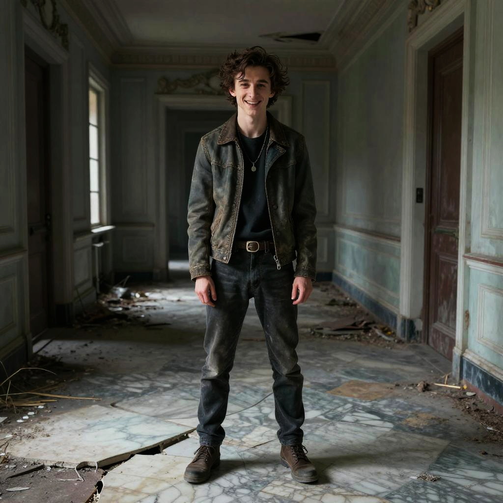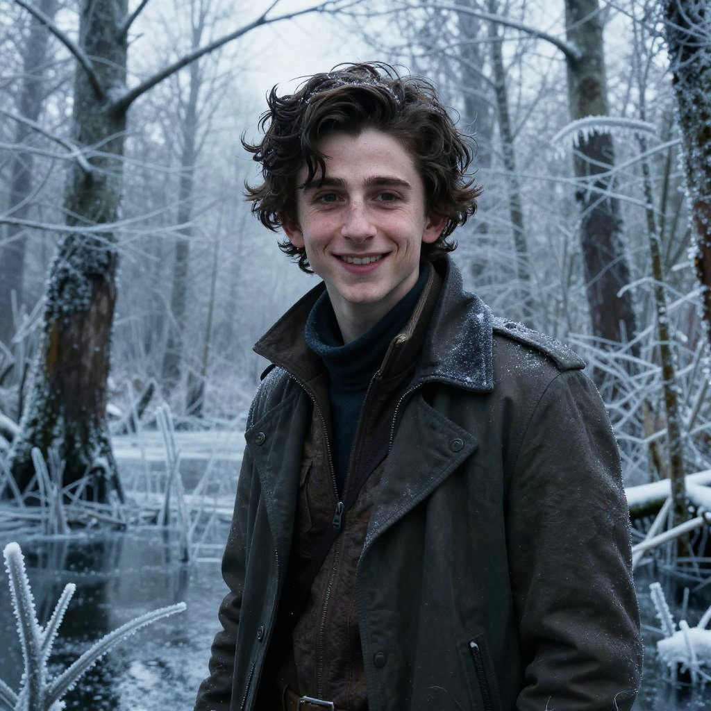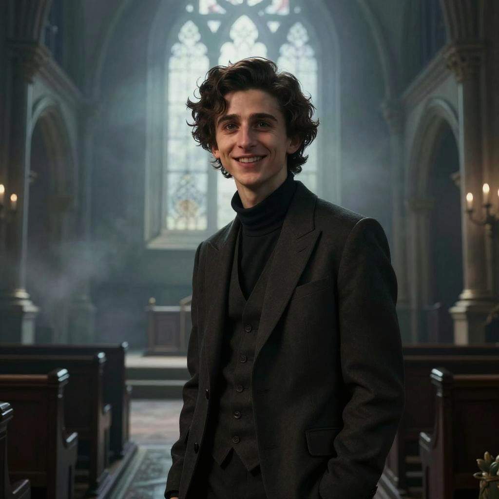 Eerie Timothee Chalamet smiling in a abandoned subway station, ultra-detailed, hyper-realistic, Volumetric, Photorealistic, ultra photo-real, intricate details, 8K, HDR, Realistic, Unreal Engine, professional photography