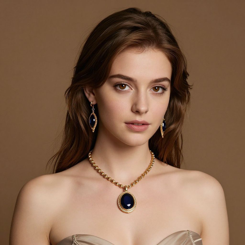 Photograph of a fair-skinned young woman with long, wavy brown hair and brown eyes, wearing a strapless, beige dress with subtle gold embellishments. She has light makeup with a natural look, and is adorned with a gold necklace featuring a large, oval, black gemstone pendant and dangling blue and gold earrings. The background is a solid, warm brown, highlighting her delicate features and elegant jewelry. Her expression is calm and slightly pensive, with soft lighting enhancing her smooth complexion. The overall style is sophisticated and timeless.