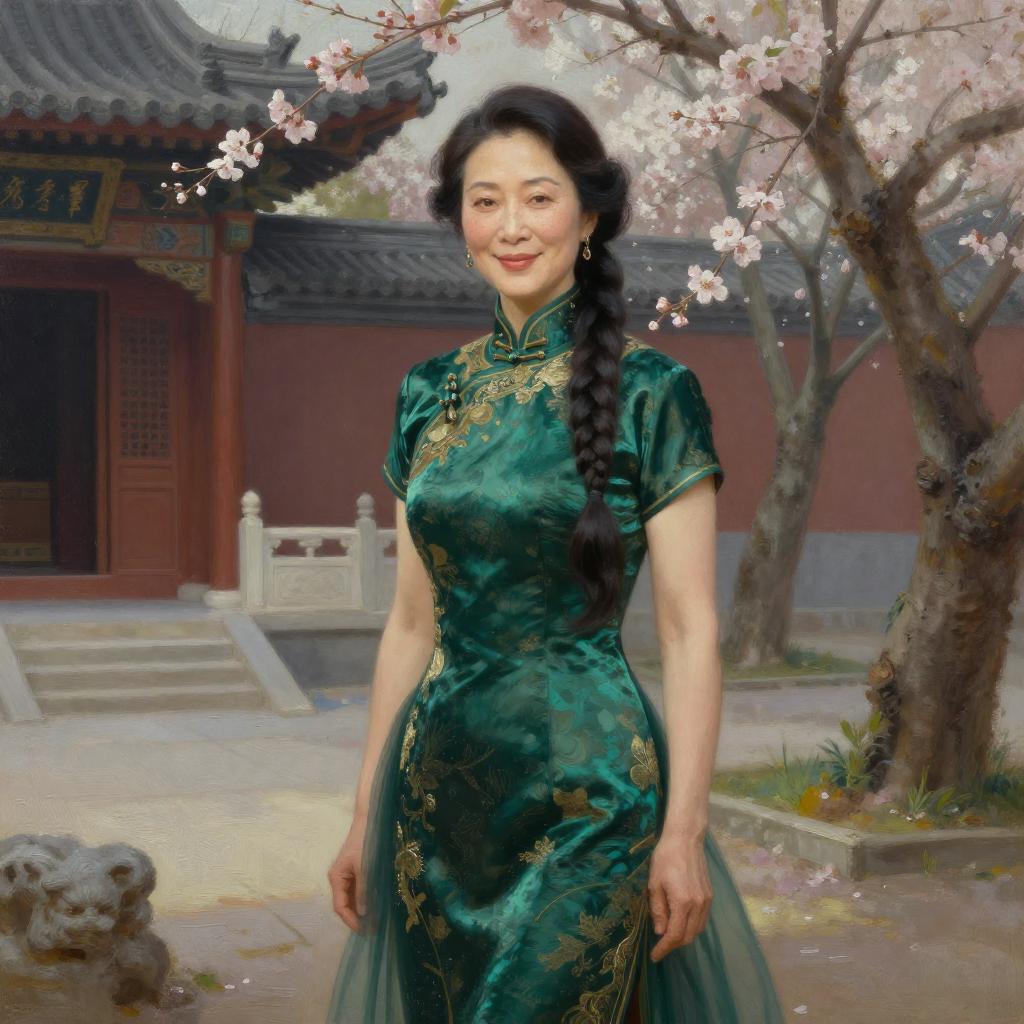 An artistic portrayal of a middle-aged East Asian woman with long braided ebony hair, subtle smile and light freckles dressed in an antique emerald silk qipao with intricate gold embroidery and a sheer chiffon overskirt, standing on an ancient temple courtyard surrounded by blossoming cherry trees, rendered in a painterly neo-romantic oil painting with soft chiaroscuro, cinematic lighting and shallow depth of field.