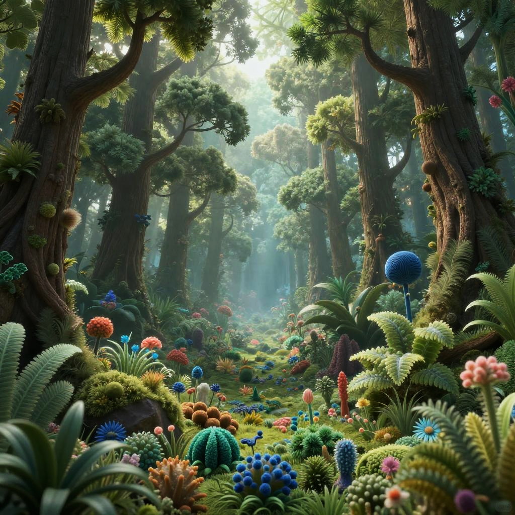 Fantastical forest scene with towering trees, vibrant, surreal plants, and colorful, whimsical flora; lush greenery bathed in dappled