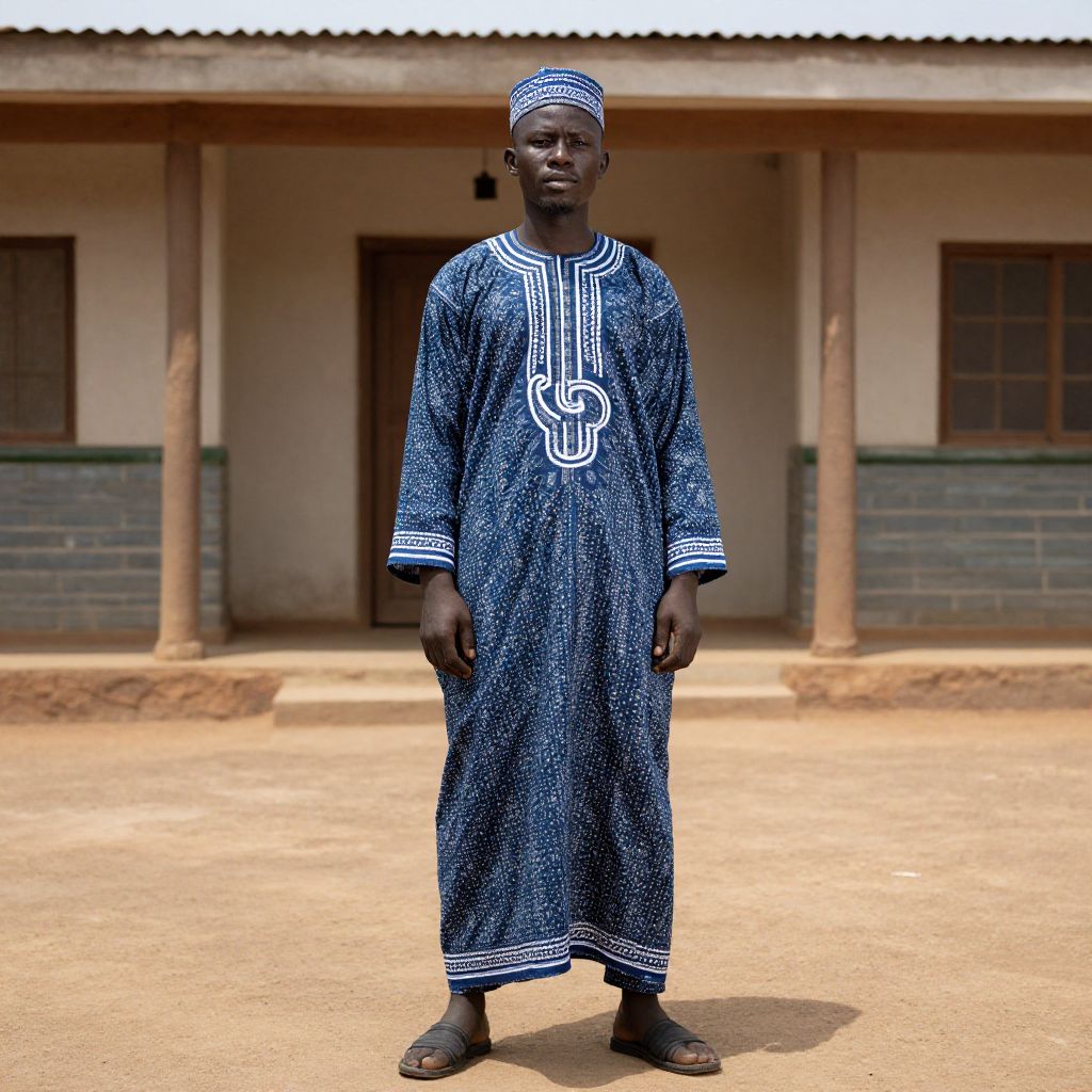 Photograph of a tall, dark-skinned African man in a blue and white patterned traditional kaftan and cap, standing on a dirt courtyard