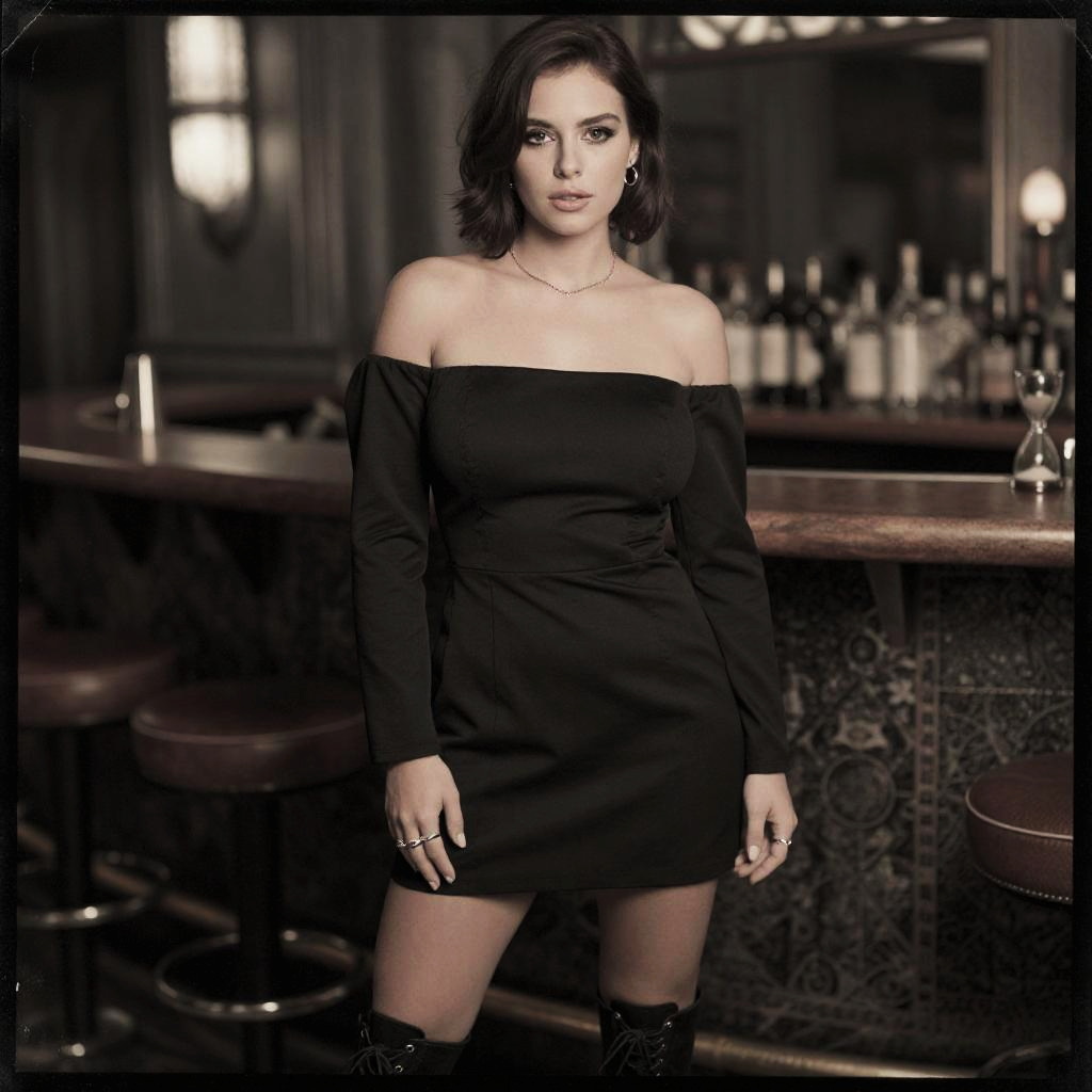 A Hourglass woman in a contemporary chic black mini dress with off-the-shoulder design and long sleeves, paired with black lace-up ankle boots, minimalist jewelry, and a single silver ring, captured in the visual style of the Calotype process at a cocktail bar with an art deco interior. Sexy. Pretty face and beаutiful eyes. Big breasts