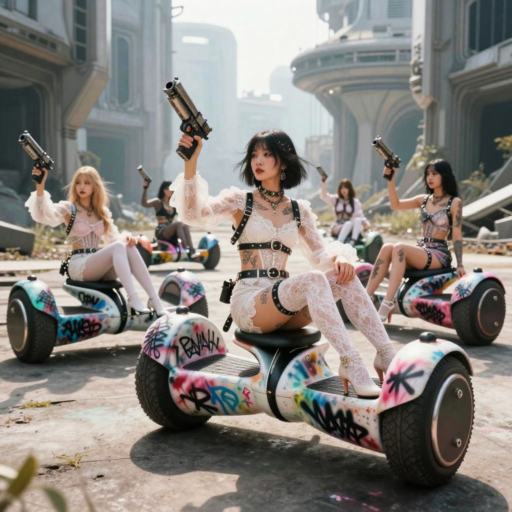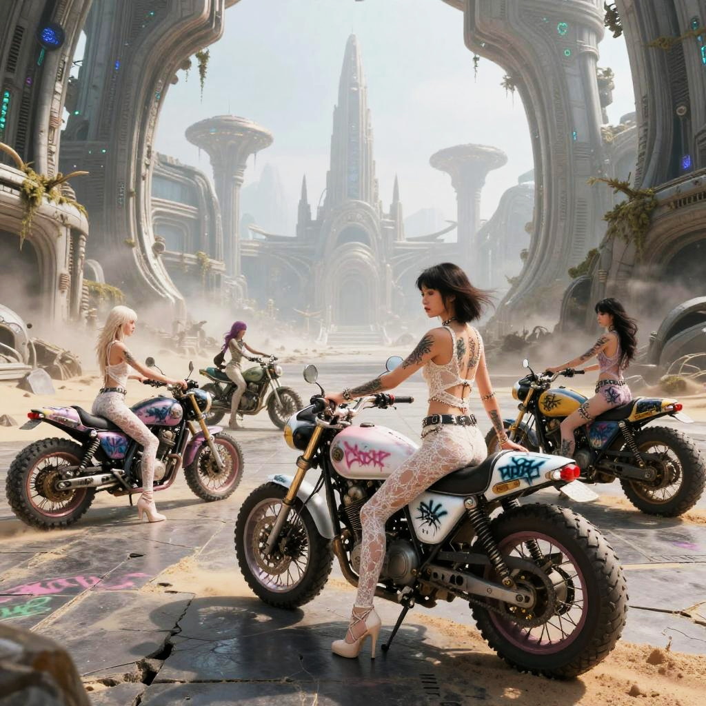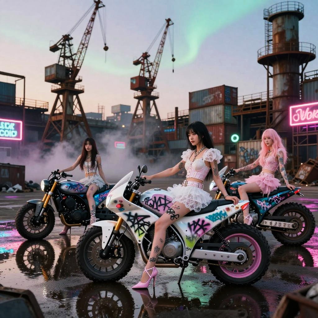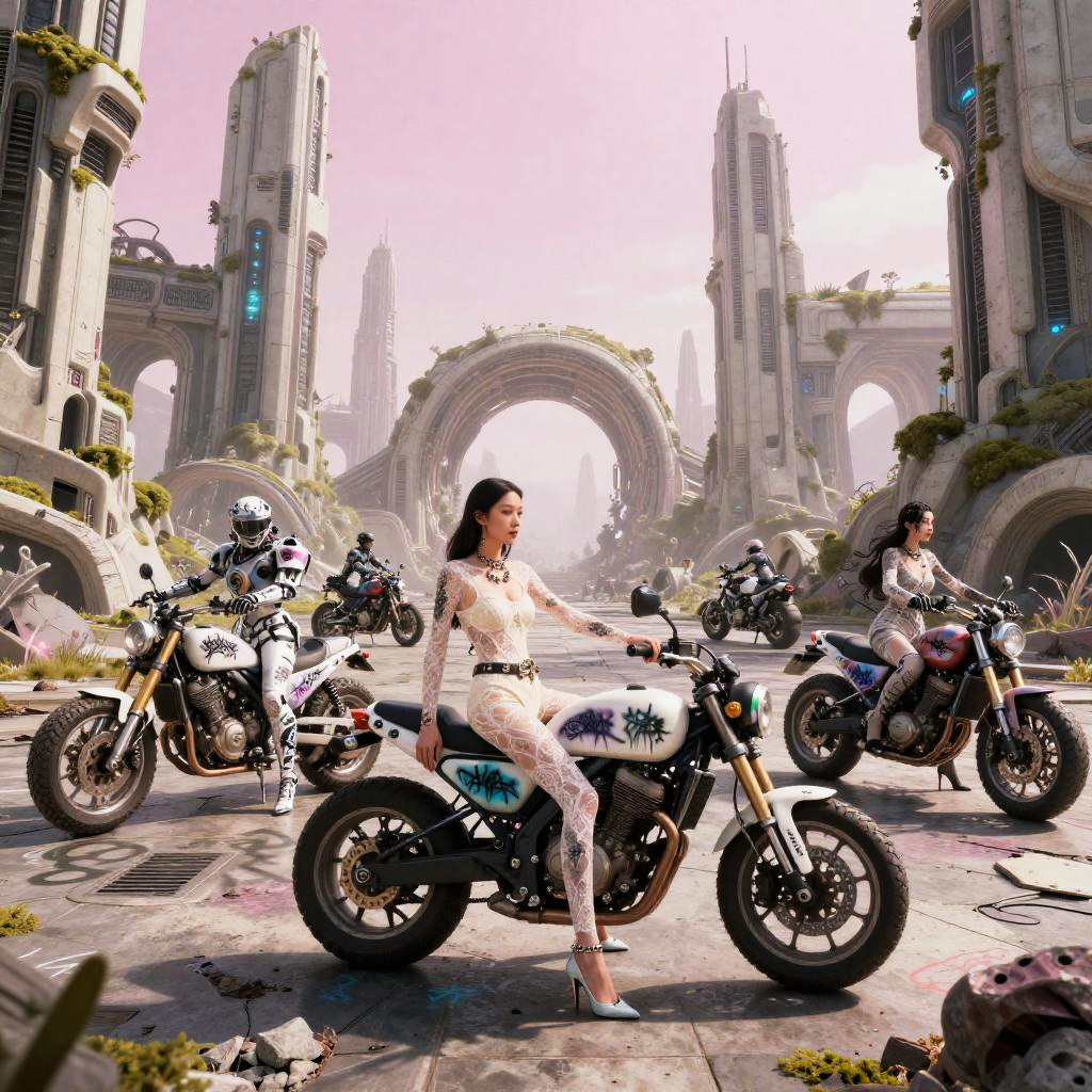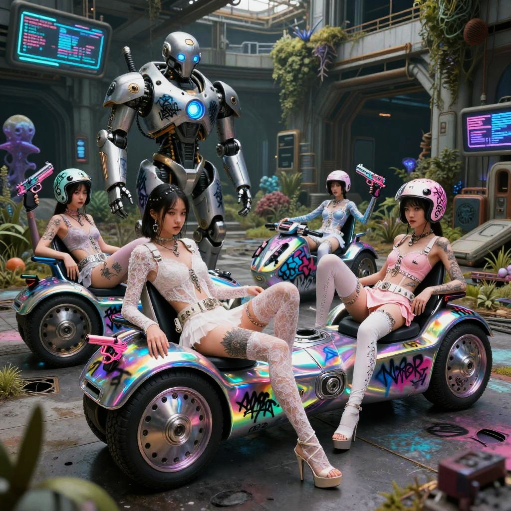 Ui/Ux Design wide angle shot of asian girl motorbike gang relaxing by their hoverbikes in Haute Couture fantasy fashion shoot in a abandoned neon subway station — flooded tiled platforms, shattered holo-ad displays, vaulted graffiti-tagged tunnels, leaking fluorescent veins and drifting steam, spraypainted bikes, graffiti, cyberpunk, dystopian, in sheer lace, graffiti, tattoos, body pierce, belt, bodice, harness, leather, guns, harness, high heels, photographed by tim walker, photorealistic, whole body, intricate 8k, pastel, pink, white, photorealistic, whole body, intricate 8k, ultra detailed, realistic, soft lighting, intricate details, beautifully color graded, Unreal Engine, Cinematic , Color Grading, Photography, Photoshoot, Shot on 85mm lens, f1.2, Depth of Field, DOF, 32k, Super-Resolution, Megapixel, Backlight, shadow Lighting, Incandescent, Optical Fiber, Studio Lighting, Soft Lighting, Volumetric, Contre-jour, neon Lighting, Accent Lighting, Global Illumination, Screen Space Global Illumination, Ray Tracing Global Illumination, Optics, Scattering, Glowing, Shadows, Rough, Shimmering, Ray Tracing Reflections, Lumen Reflections, Screen Space Reflections, Diffraction Grading, Chromatic Aberration, GB Displacement, Scan Lines, Ray Tracing Ambient Occlusion, Anti-Aliasing, FKAA, TXAA, RTX, SSAO, Shaders, OpenGL-Shaders, GLSL-Shaders, Post Processing, Post-Production, Cell Shading, Tone Mapping, CGI, VFX, SFX, insanely detailed and intricate , hyper maximalist , elegant, hyper realistic, super detailed, dynamic pose, photography, Hyper realistic, volumetric, photorealistic, ultra photoreal, ultra-detailed, intricate details, 8K, super detailed, full color, ambient occlusion, volumetric lighting , high contrast , HDR,