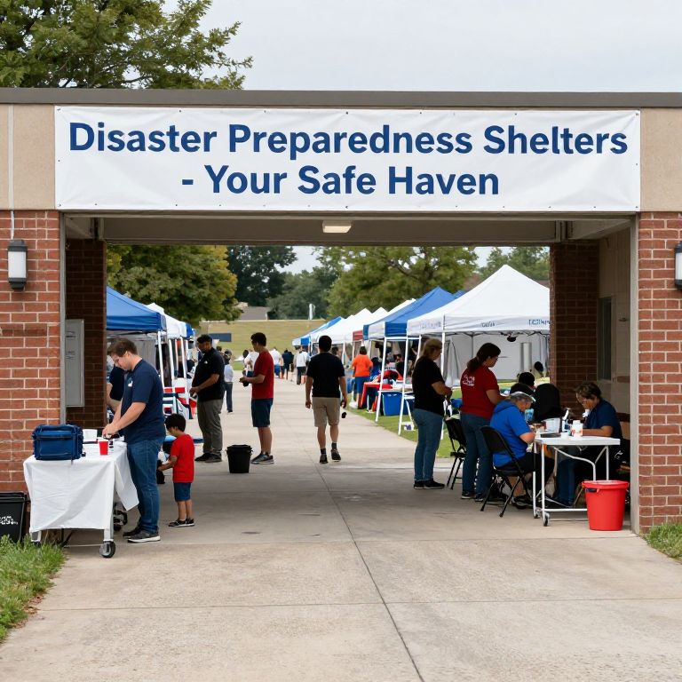 A wide shot of a community disaster preparedness shelter, filled with families and first aid stations, with a large banner saying 'Disaster Preparedness Shelters - Your Safe Haven' above the entrance