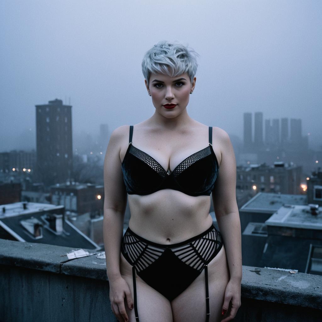 Image in the style of Surrealist David Lynch, enigmatic storyteller, asymmetrical silver pixie cut, curvy frame, lingerie cut-out set, velvet bralette with chiffon panels, leather thong, foggy twilight urban background