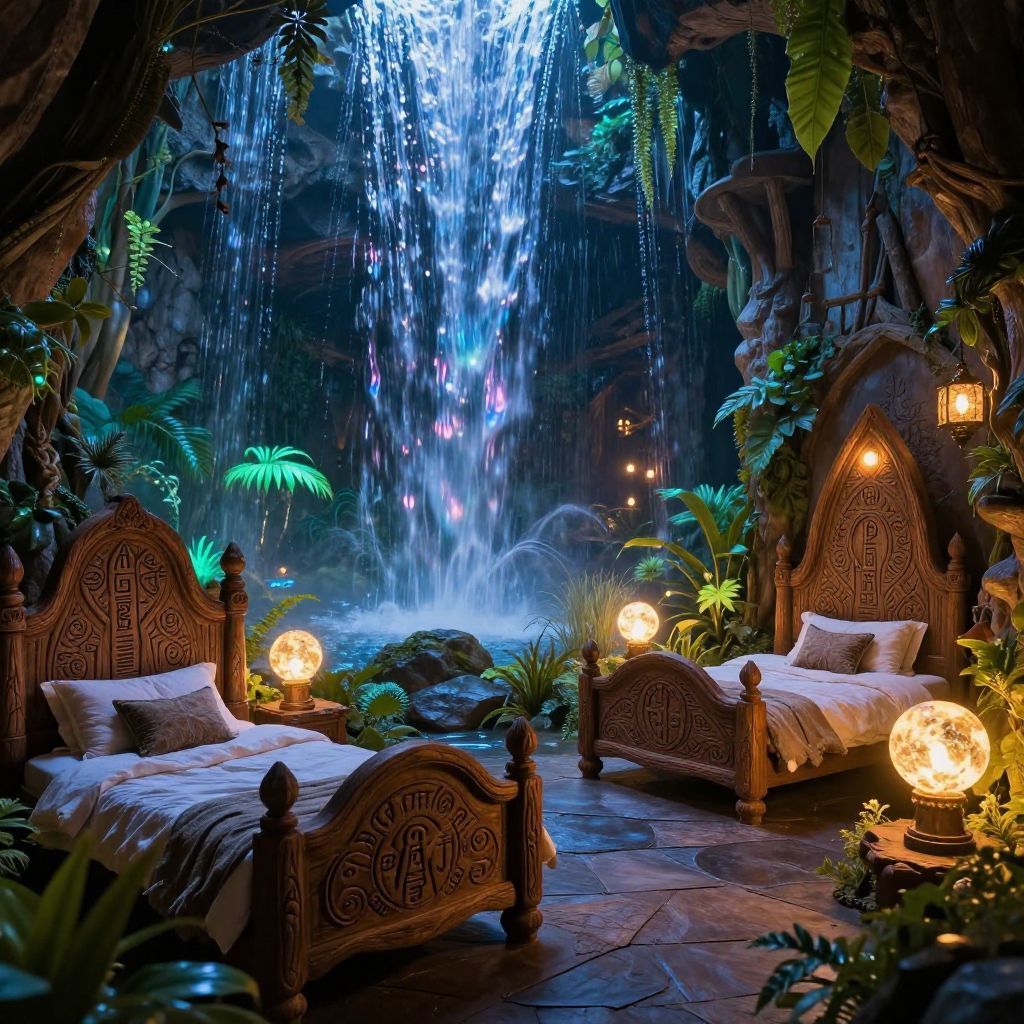 Magical fantasy bedrooms featuring ethereal canopies, sparkling starry ceilings, mystical artifacts, lush velvet fabrics, and a serene, cozy atmosphere in an imaginative, enchanted forest setting.