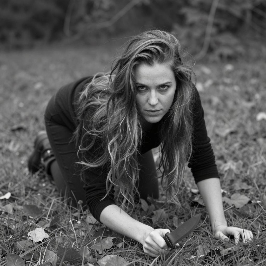 Silhouetted figure of a person with long, wavy hair standing on a flat surface. Holding a large knife in their right hand, legs apart. Background is a clear, gradient blue sky. Person is wearing a fitted jacket and pants. Sunlight highlights the top of their head.