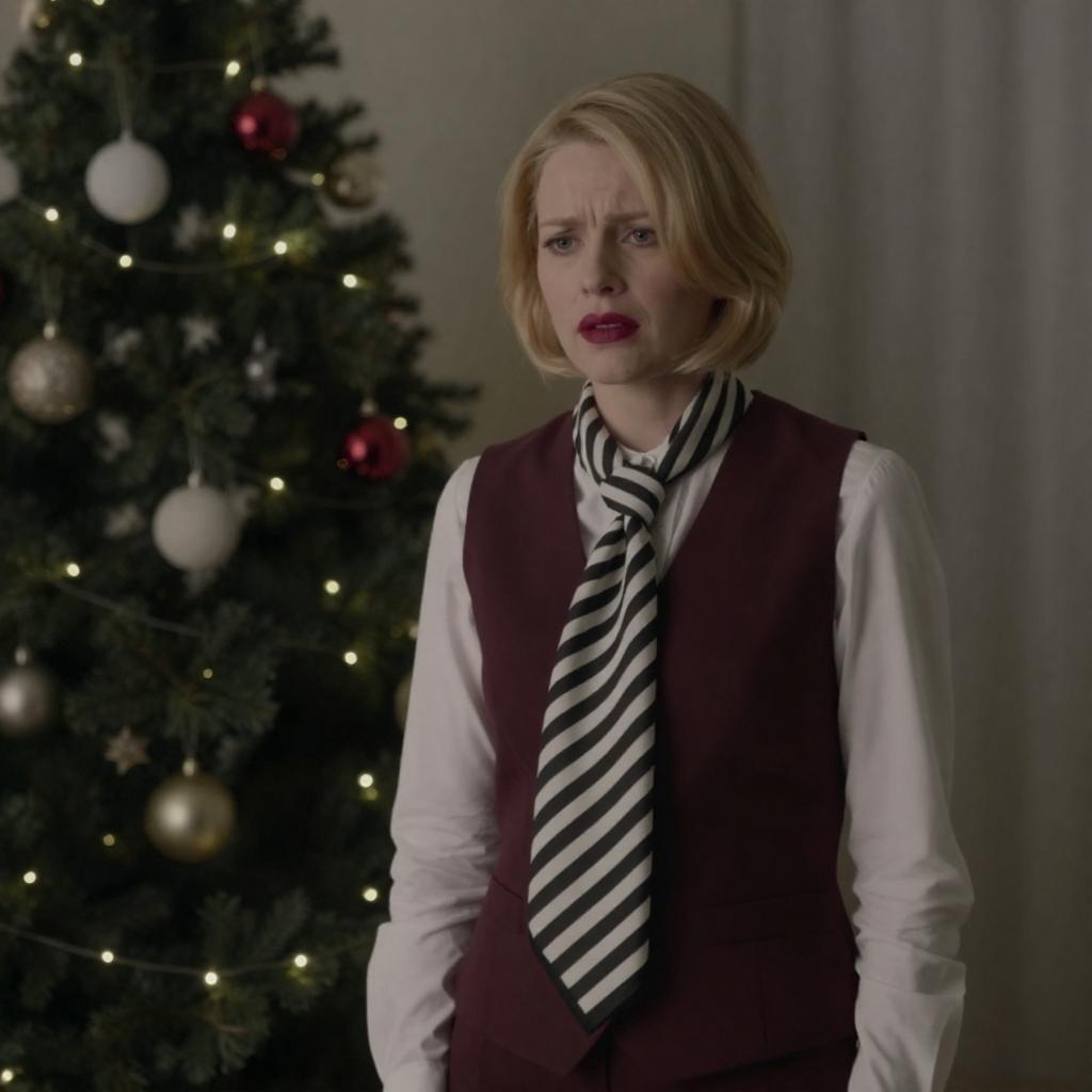 Short-haired blonde woman with red lipstick, wearing maroon vest over white shirt and black-and-white scarf, standing next to decorated Christmas tree with lights, looking concerned. Indoor setting with dim lighting, patterned curtain in background. Upper body visible.