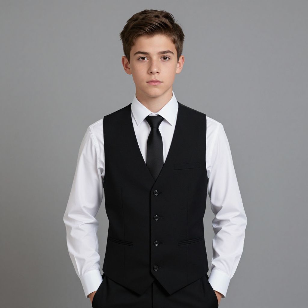 Gents formal wear costume, male focus, 1boy, solo, necktie, vest, shirt, white shirt, realistic, brown hair, collared shirt, looking at viewer, black vest, closed mouth, black necktie, hands in pockets, long sleeves, brown eyes, formal