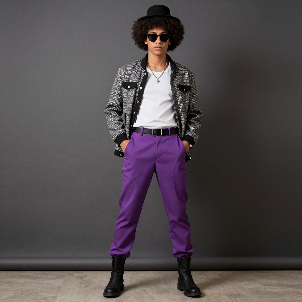 "willy wonka violet, 1boy, solo, male focus, hat, striped socks, bow, bowtie, top hat, fishnets, full body, mustache, socks, afro, striped clothes, standing, jacket Realistic photo of casual sexy person with pretty face"