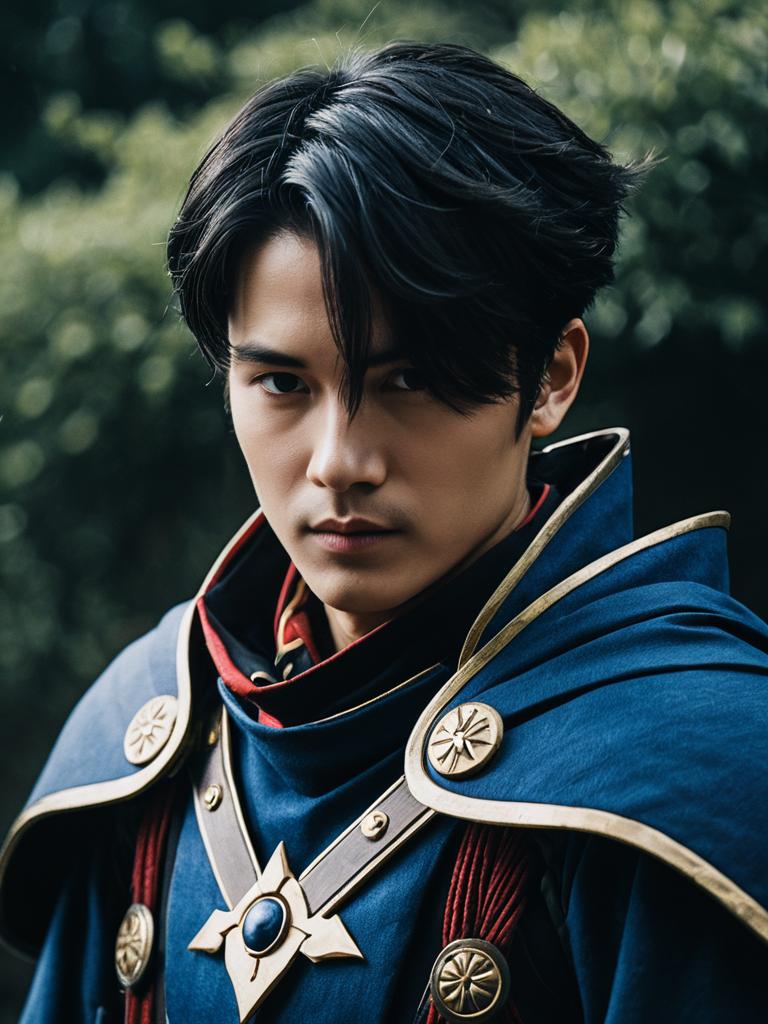 Man in Childe Genshin Outfit, cinematic realism, heroic editorial portrait