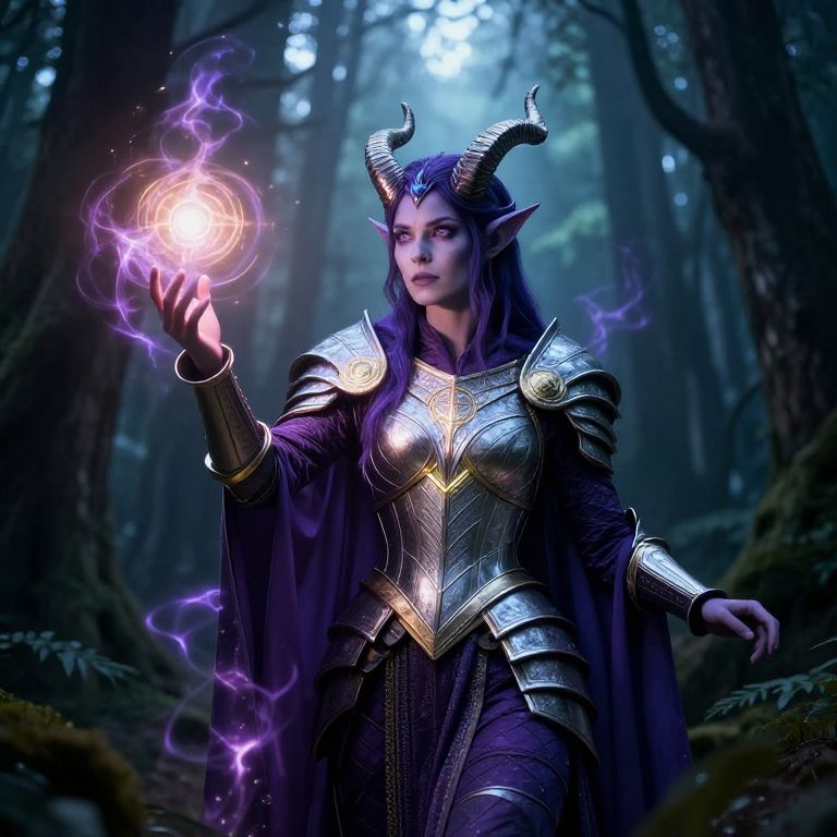 Digital artwork of a dark elf woman with purple hair, horns, and glowing armor, conjuring a magical light in a mystical forest.