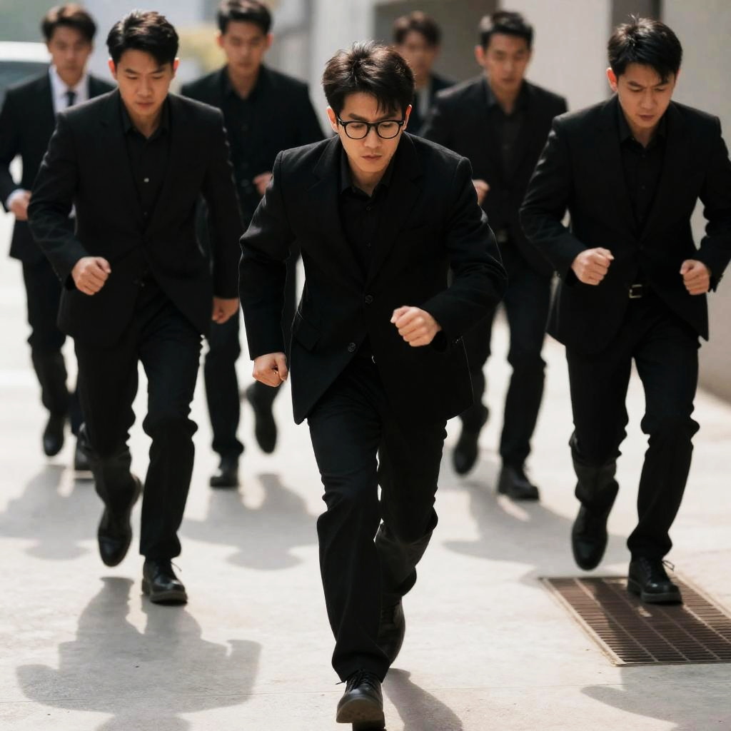 Photograph of a group of Asian men dressed in black suits, running with determined expressions on a concrete pavement. The central figure wears glasses and a black coat, leading the group in mid-stride with clenched fists. The background features other similarly dressed men, emphasizing a coordinated and intense urban scene.