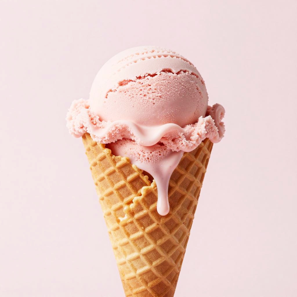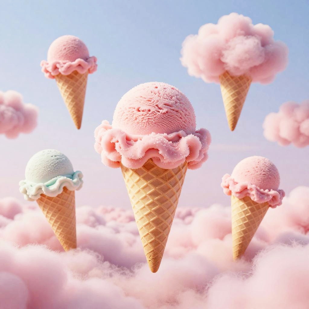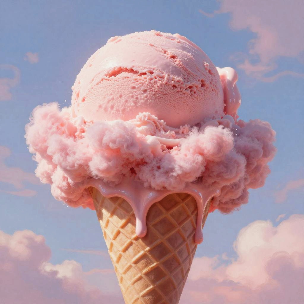 Pink clouds ice cream, a serene scene of a child enjoying a cone dripping with pink cloud ice cream, lush meadow background, soft focus, magical realism, painterly textures