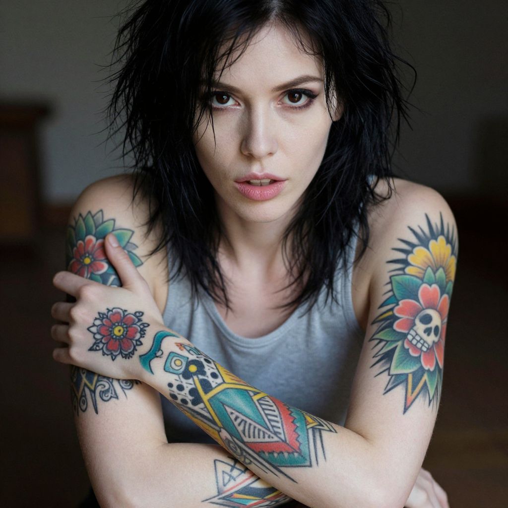 Photograph of a pale-skinned woman with black, messy hair and intense, dark eyes. She's wearing a gray tank top and has colorful, intricate tattoos on both arms, featuring flowers, skulls, and geometric shapes. She's sitting with her arms crossed over her chest, looking directly at the camera with a slightly parted, pink-lipped mouth. The background is blurred and dark, making her and her tattoos the focal point.