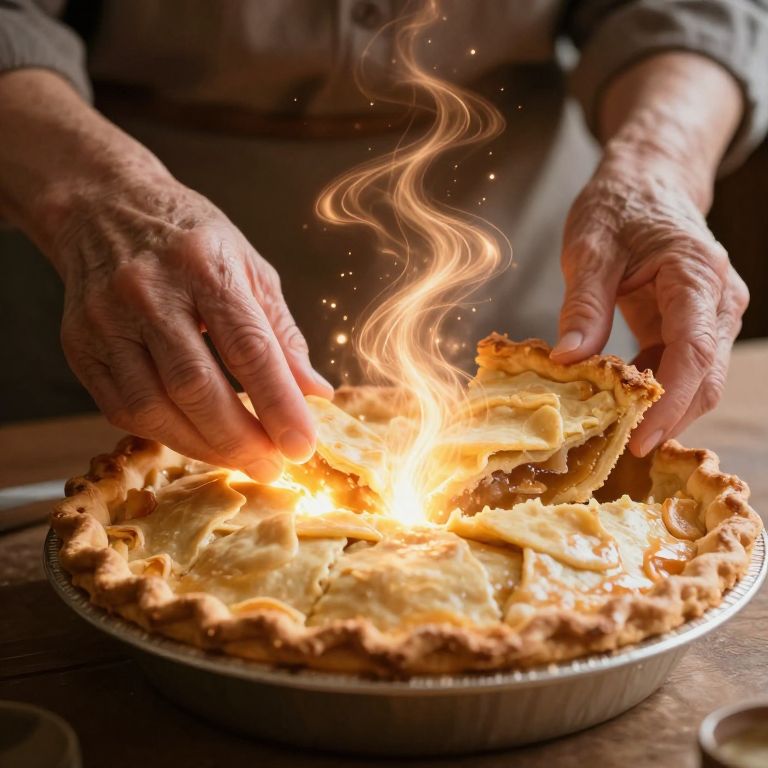 Grandma, with her hands gently touching a freshly baked pie, releases radiant wisps of light that swirl above its golden crust, infusing each slice with ethereal, glowing memories.