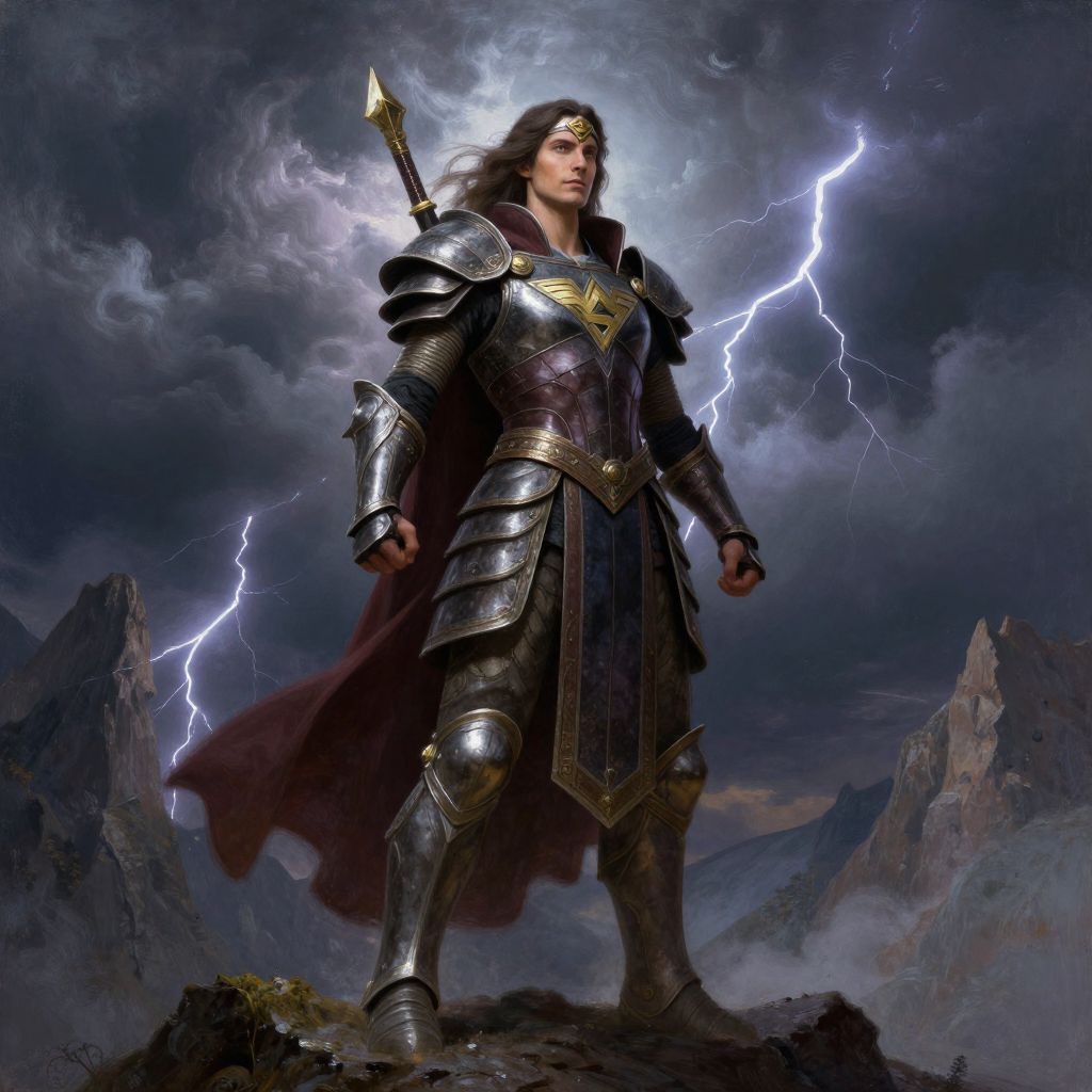 Digital artwork of a muscular, long-haired man in dark, ornate armor with a sword, standing amid lightning on a rocky mountain.