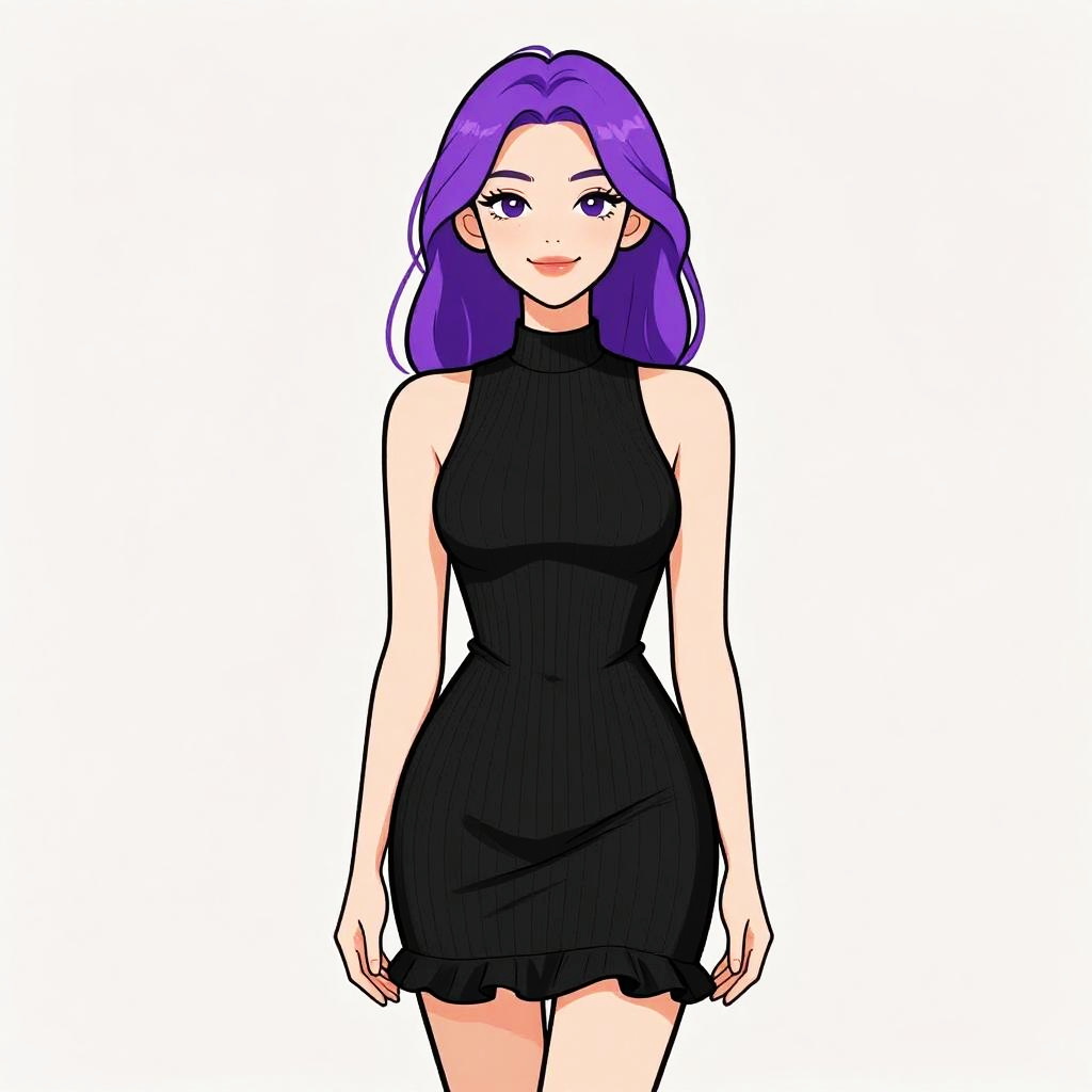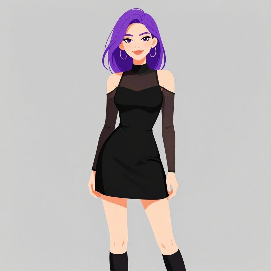 Woman with pretty face and pretty hair. smiling Woman, contemporary, cold-shoulder black mini dress, high neckline, long sheer sleeves, fitted bodice, flared skirt, above-knee length, solid black fabric with sheer paneling at shoulders and arms, black knee-high socks, gray studio background. --sref 1467