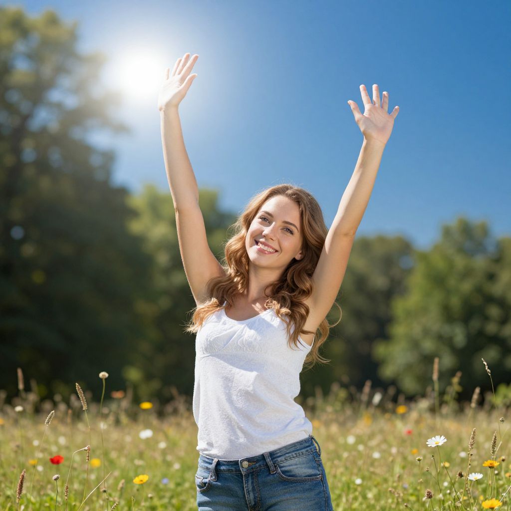 Photograph of a young Caucasian woman with wavy brown hair, wearing a white sleeveless top and blue jeans, standing in a sunny meadow. She has her arms raised high, smiling broadly with her eyes closed, basking in the sunlight. The background features a clear blue sky, bright sun, and lush green trees. The meadow is filled with tall grass and scattered wildflowers, including daisies and red poppies. The sunlight creates a bright, cheerful atmosphere, highlighting her joyful expression and carefree pose.