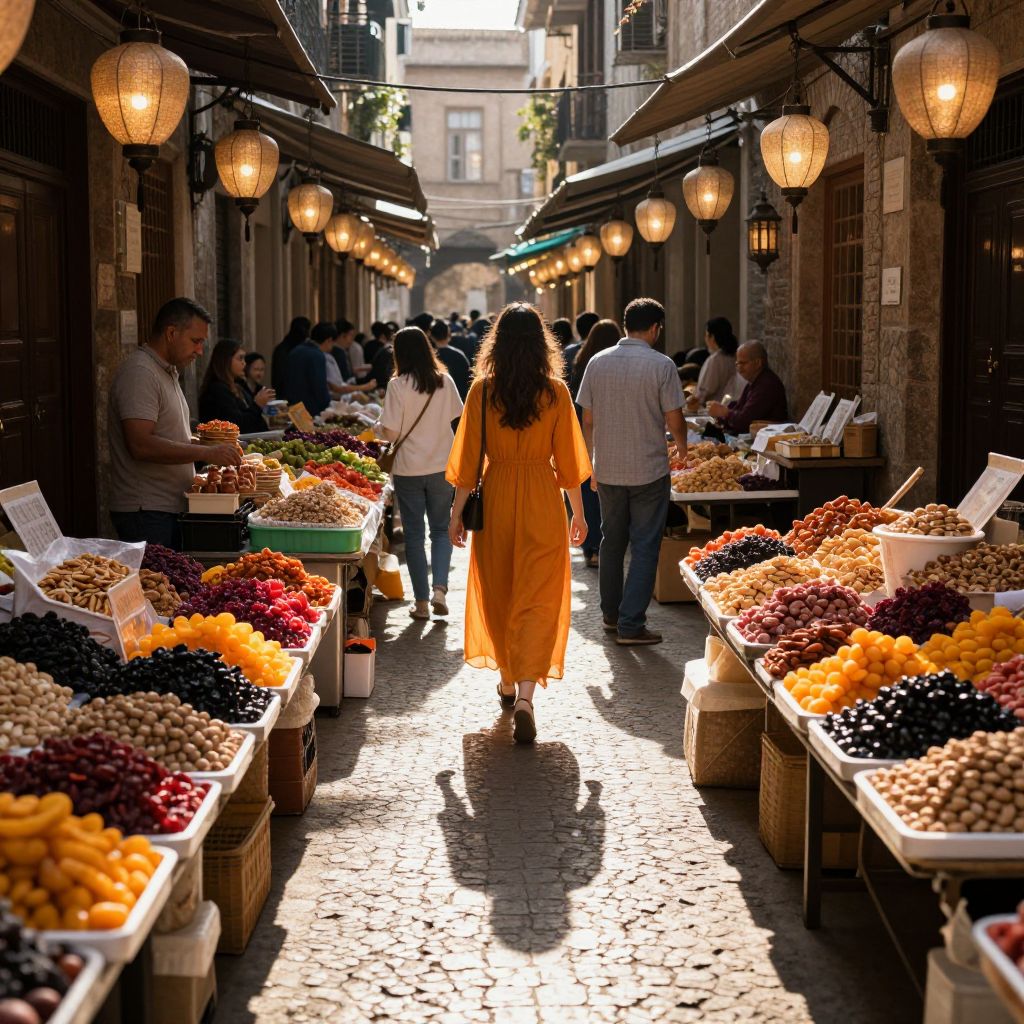 Sunlit alleyway bustling with vendors and shoppers, lined with tables piled high with colorful dried fruits and nuts, as a woman in a flowing orange dress walks away, her shadow stretching long on the cobblestone path beneath the warm glow of hanging lanterns.
