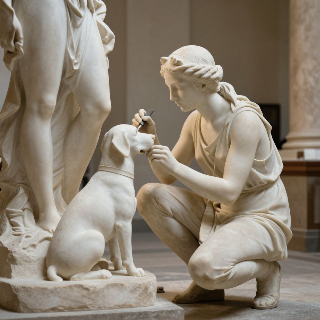 Sculptor crouches beside a serene marble statue of a woman and her dog, meticulously carving details with a tool while the classical architecture frames the scene in soft, warm light.