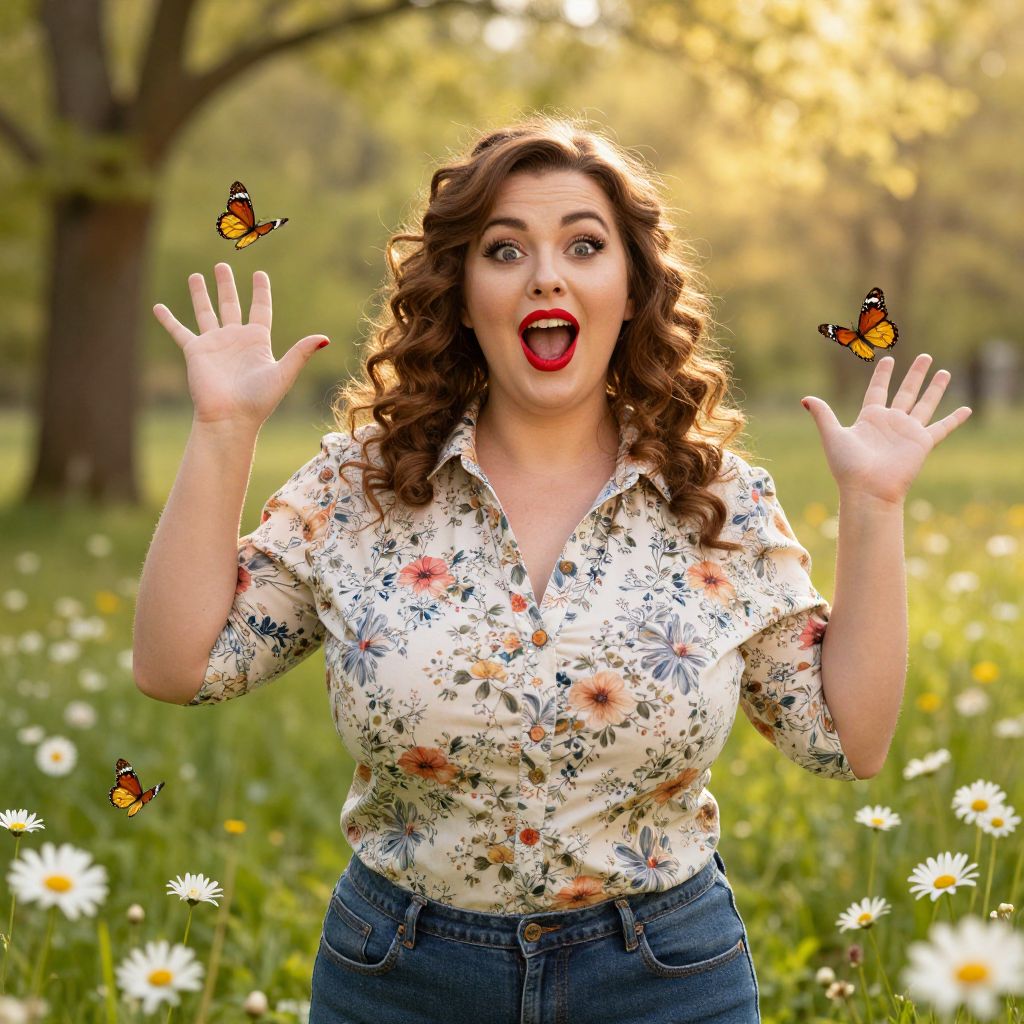 A playful, curvy woman with bright red lipstick and curly brown hair wearing a floral-patterned woman button shirt in a whimsical costume, standing on a sunny meadow during springtime, surrounded by blooming daisies and butterflies, with soft golden sunlight filtering through the trees.. The woman has big tits and cute face