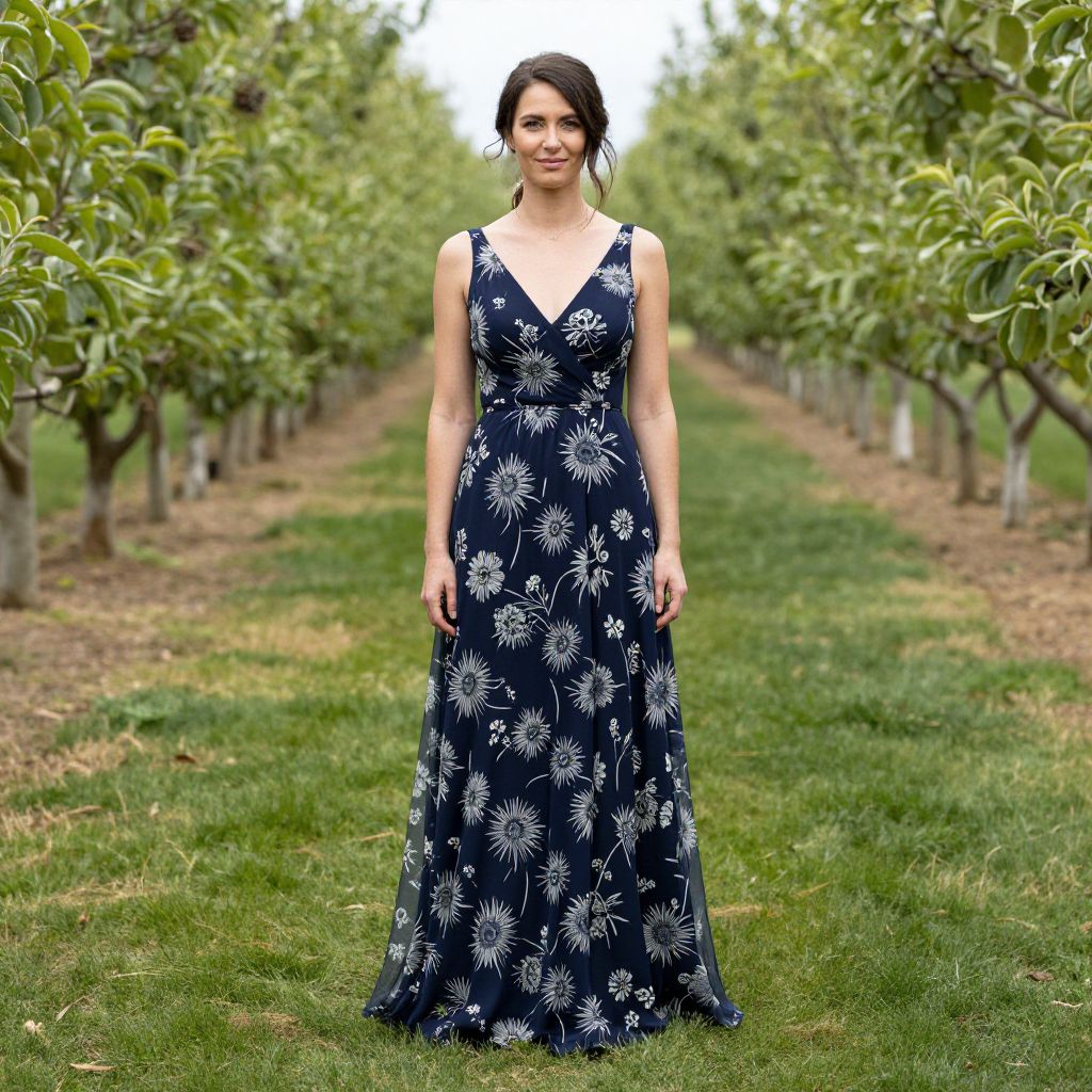 Woman wearing a navy passion flower print floral organic cotton bridesmaid dress stands gracefully in a picturesque orchard pathway lined with neatly trimmed trees and vibrant greenery.