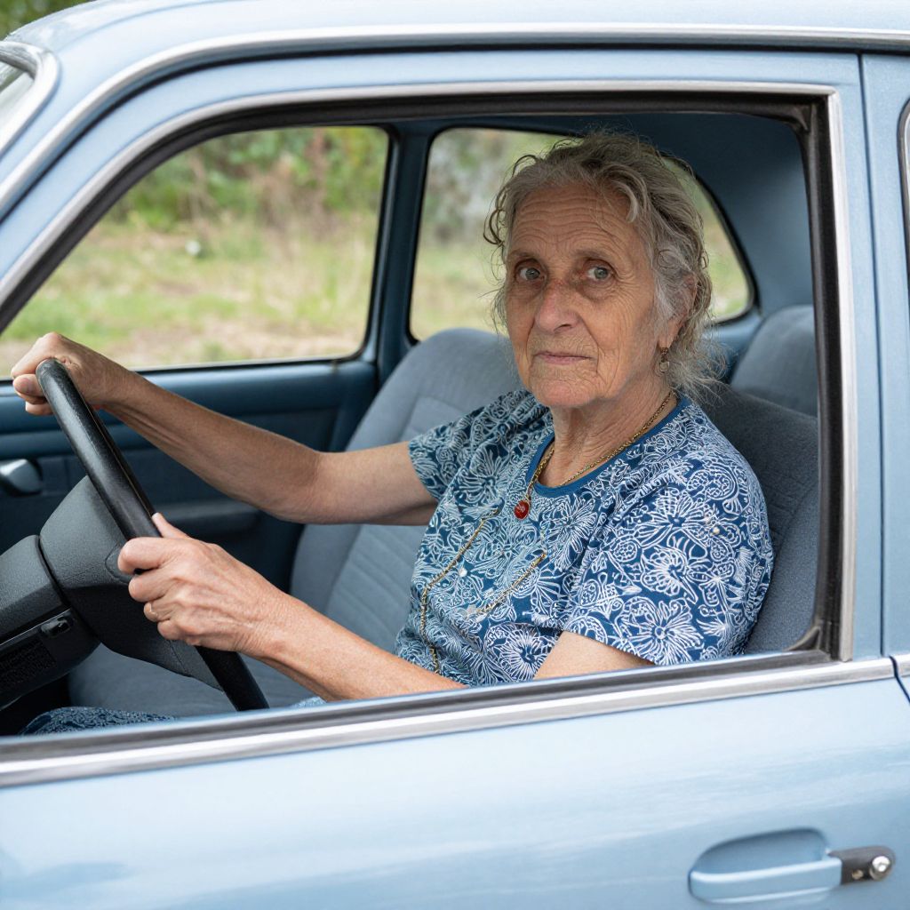 Photograph of an elderly woman with wrinkled skin, gray hair, wearing a blue patterned shirt, driving a light blue vintage car.