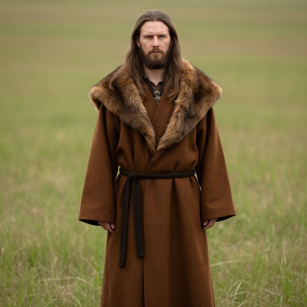 Man with long hair and a beard, wearing a brown robe with a fur collar, standing in a grassy area.