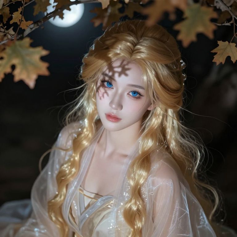 Envision a hyperrealistic portrait of an East Asian goddess, her piercing blue eyes and cascading golden hair creating an enigmatic aura. From a bird's-eye perspective, we admire her ethereal features and delicate gossamer robes, illuminated by soft moonlight filtering through ancient oak branches. The shimmering shadows cast upon her face reveal timeless beauty and mystery, evoking reverence and wonder.