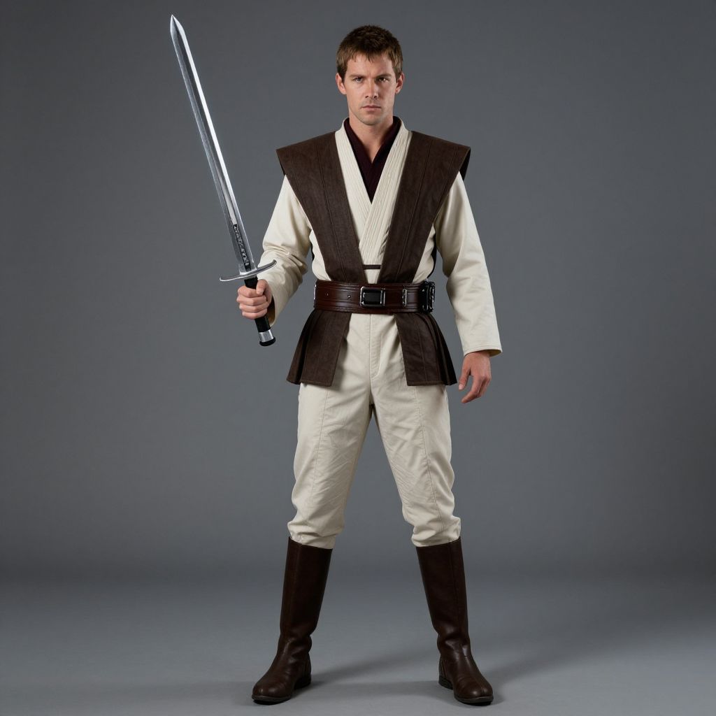 Jedi Knight Costume, man dressed in a jedi costume with a sword